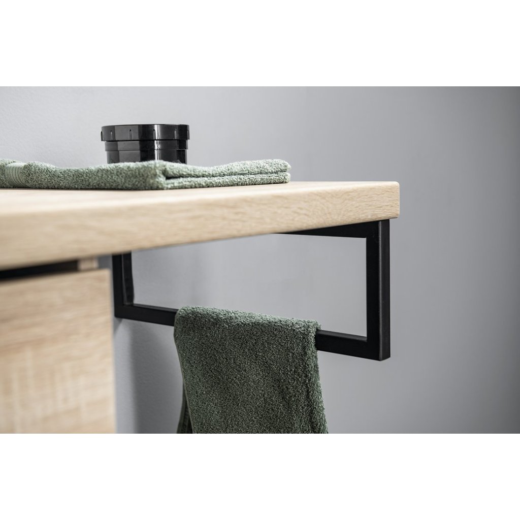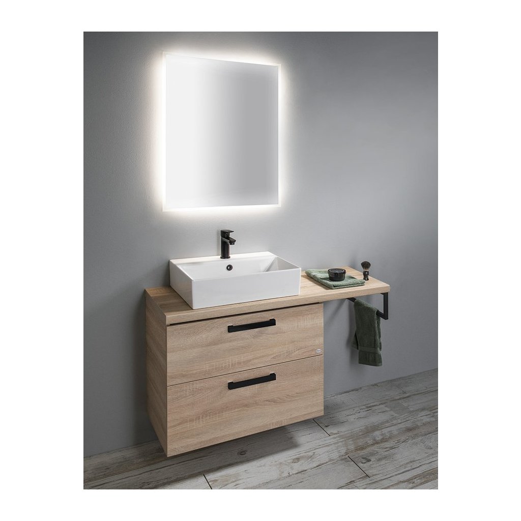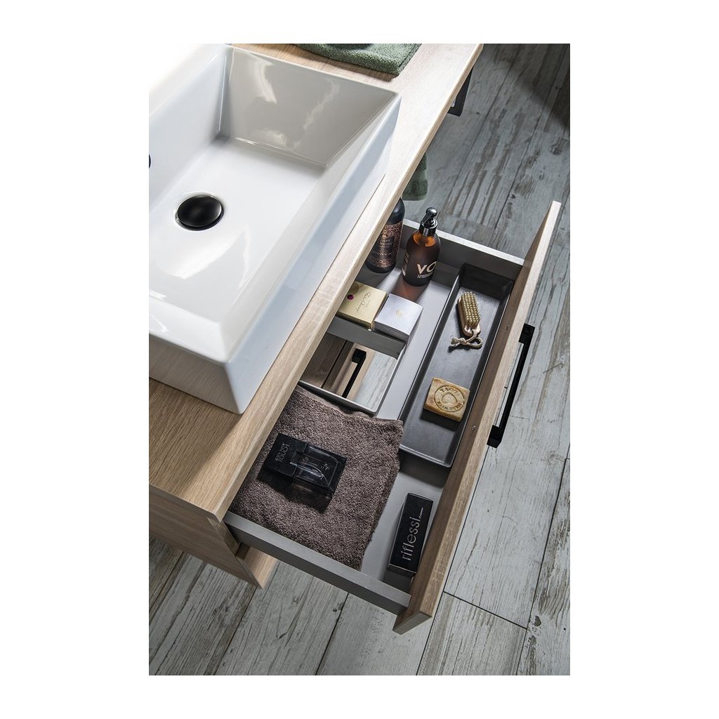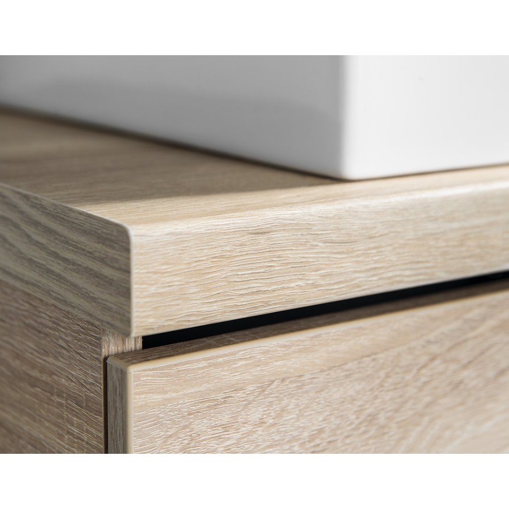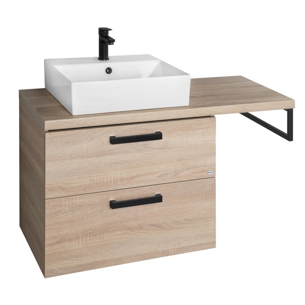 Koupelnový nábytek VEGA s deskou VEGA (HPL) v dekoru dub platin lze kombinovat s umyvadly na postavení.