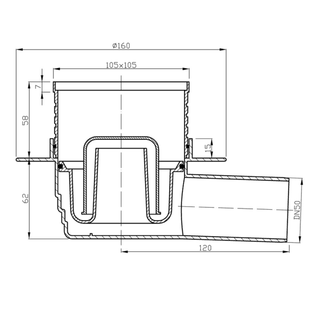 Bruckner, Podlahová vpusť 105x105 boční, odpad 50mm, nerez, 183.018.0