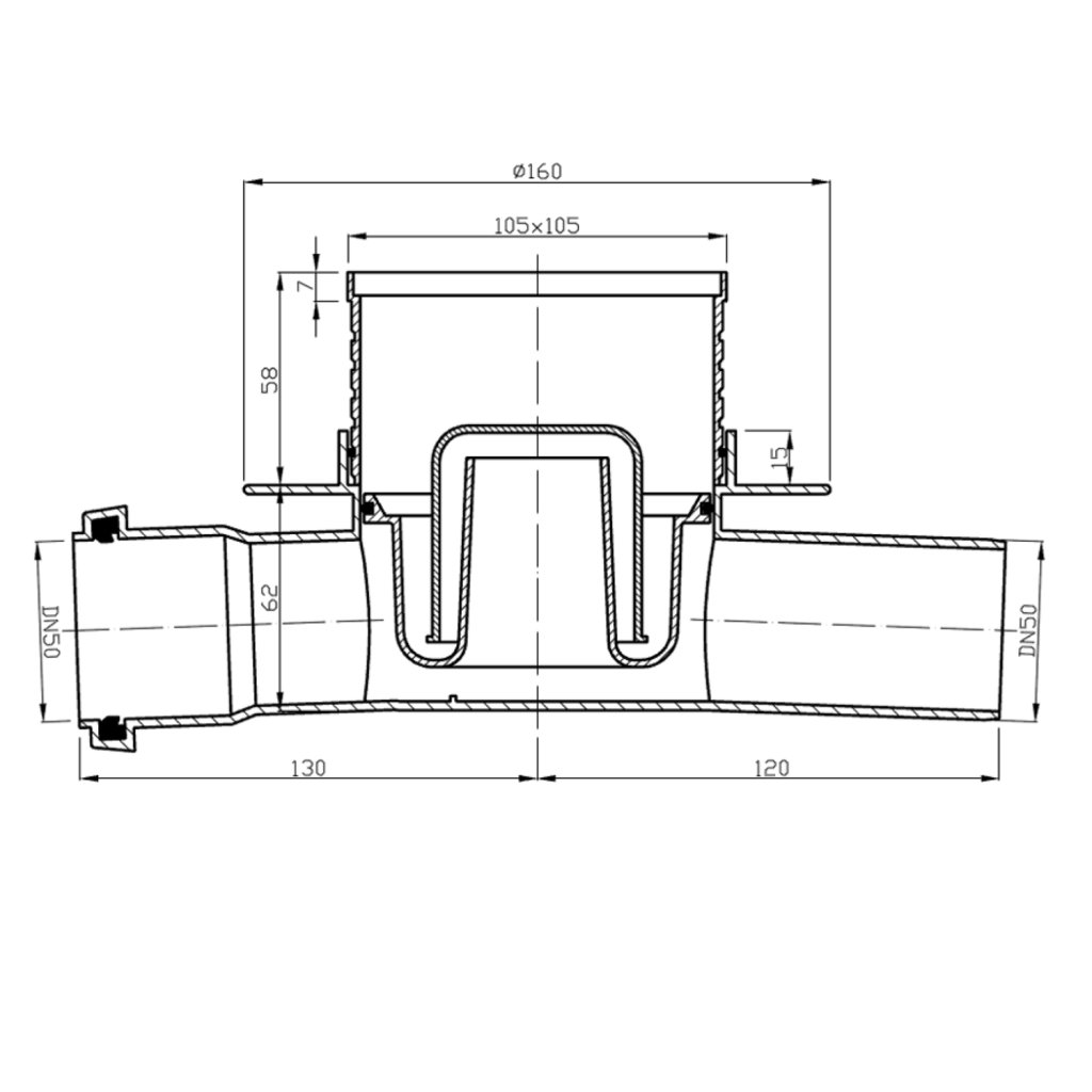 Bruckner, Podlahová vpusť 105x105 průběžná, odpad 50mm, nerez, 183.026.0
