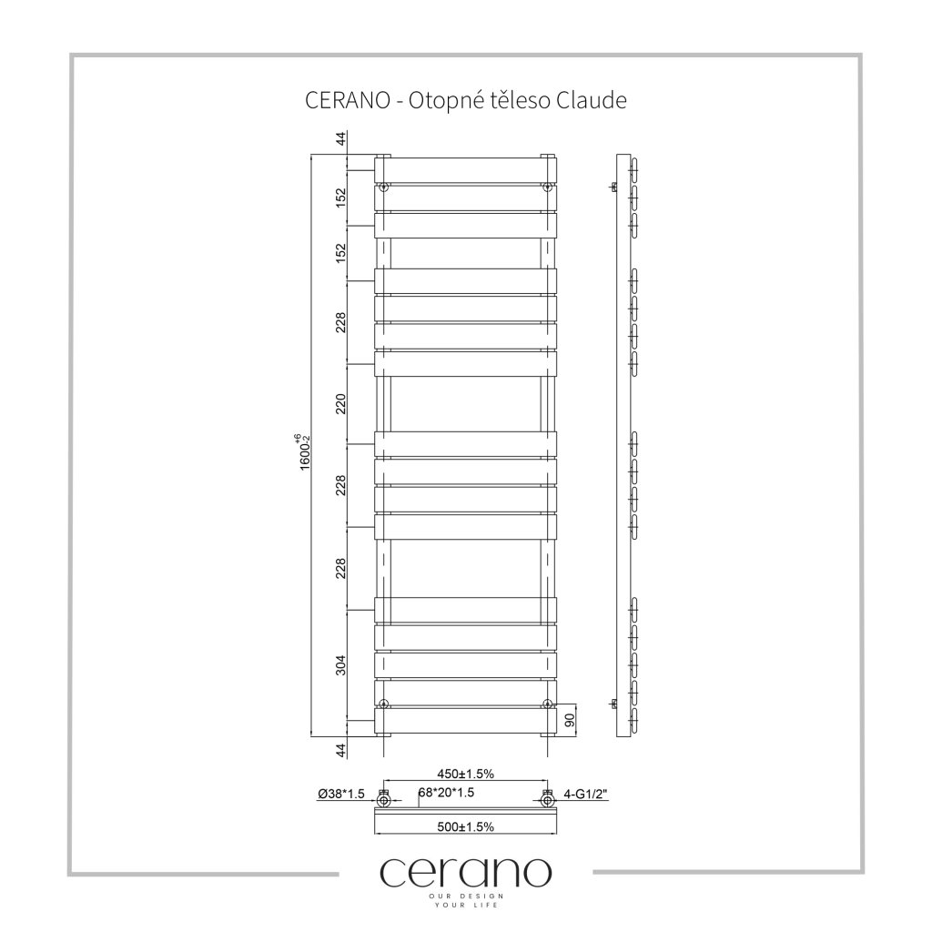 CERANO - Topné těleso Claude - kombinovaný - 866W - černá matná - 1600x500 mm