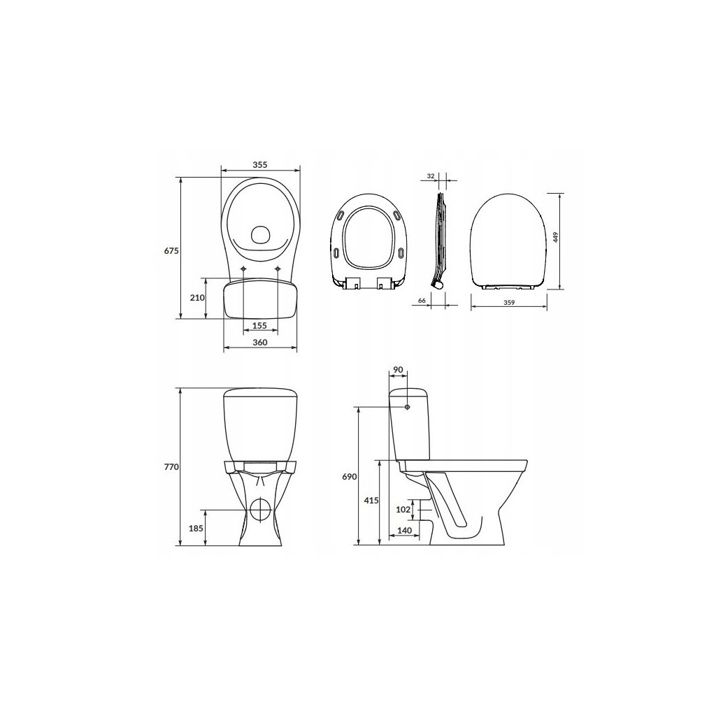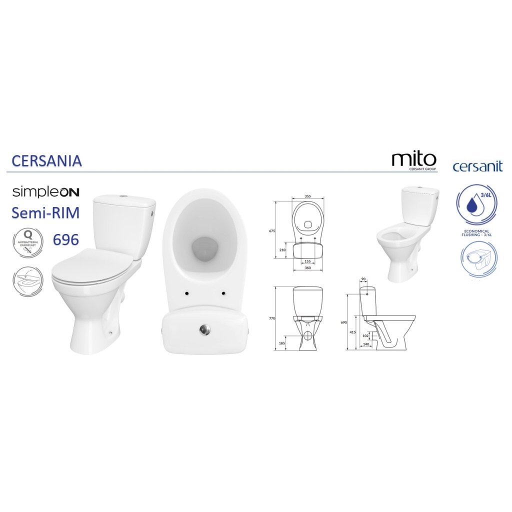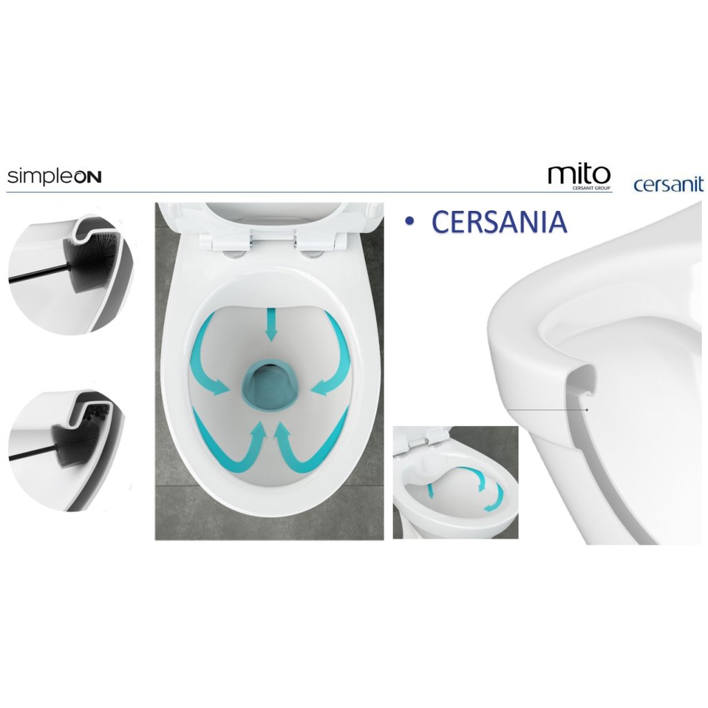 WC kombi Cersania SIMPLEON se zadním odpadem, přívod vody z boční části nádrže s úsporným splachovacím systémem 3/6l. Součástí je duroplast antibakteriální sedátko SLIM s pomalým sklápěním /soft close/ a snadným odebráním a upevněním sedátka.