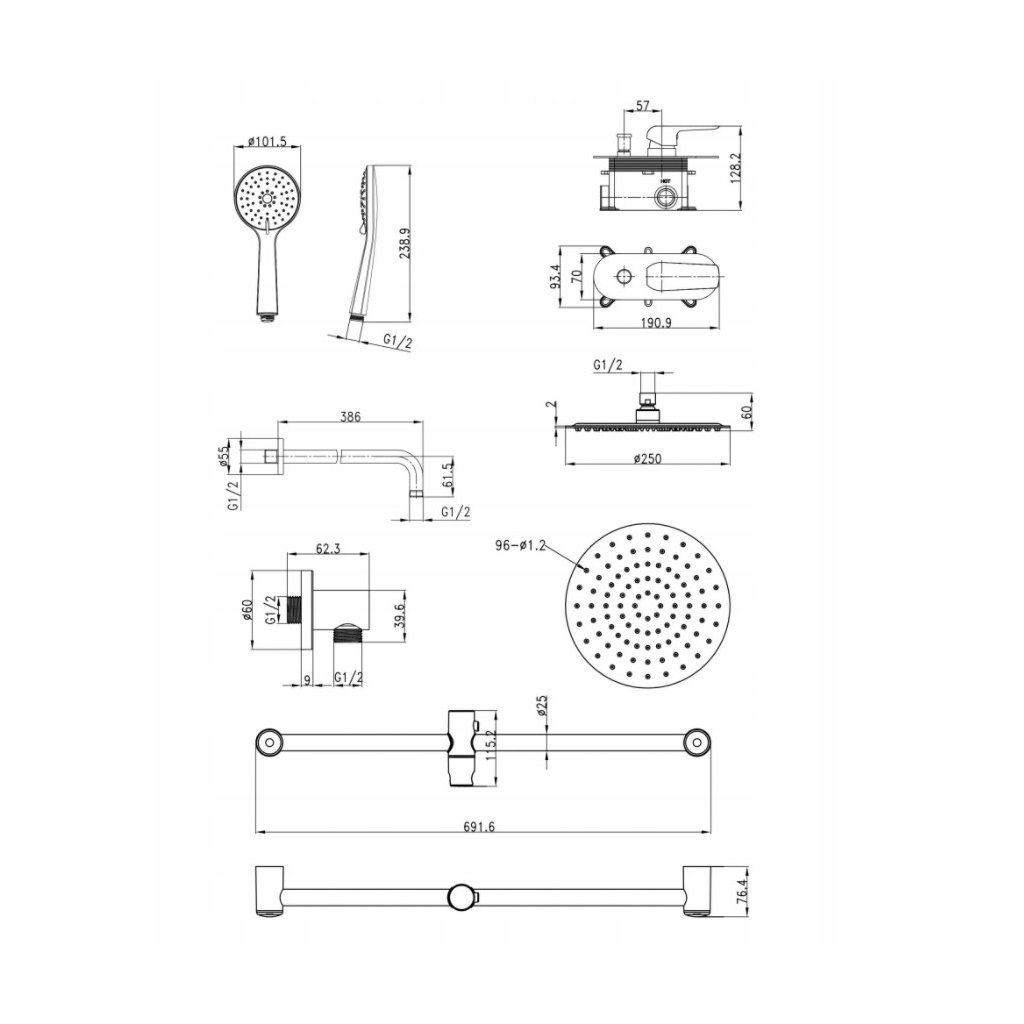 - V ceně sady: baterie s přepínačem, dešťová sprcha, ruční sprchová hlavice, sprchová hadice, sprchový sloup, sprchové rameno