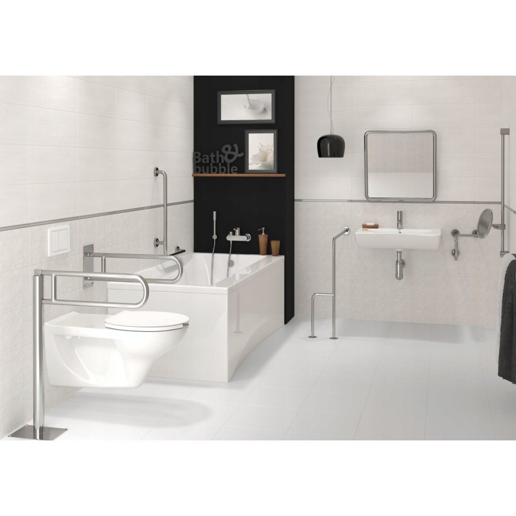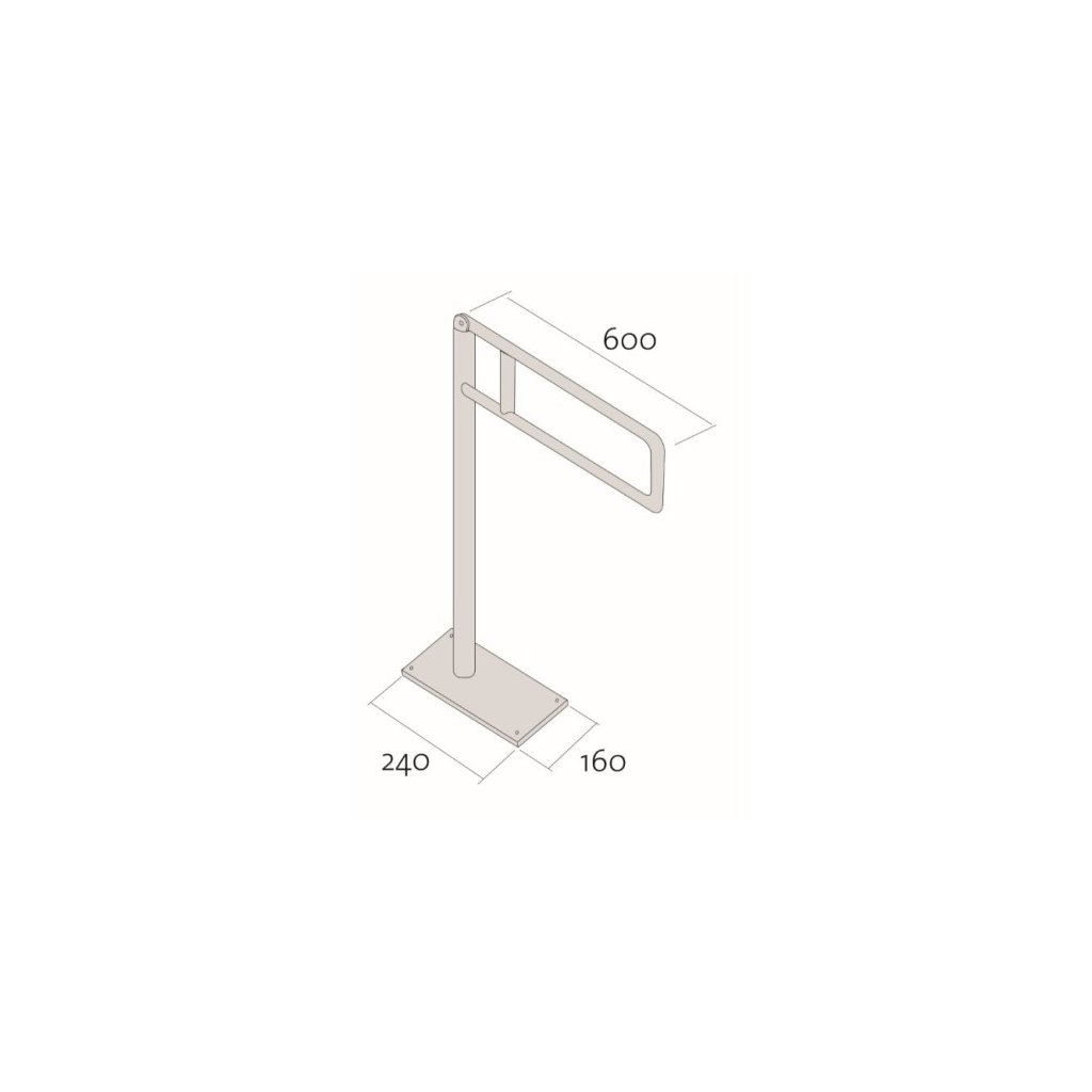 Elegantní lesklé chromované ocelové zábradlí připevněné k podlaze. Robustní design a ergonomický tvar rukojeti poskytují pohodlnou oporu při používání toalety. Produkt je k dispozici v naklápěcí verzi. Maximální zatížení je 120 kg.