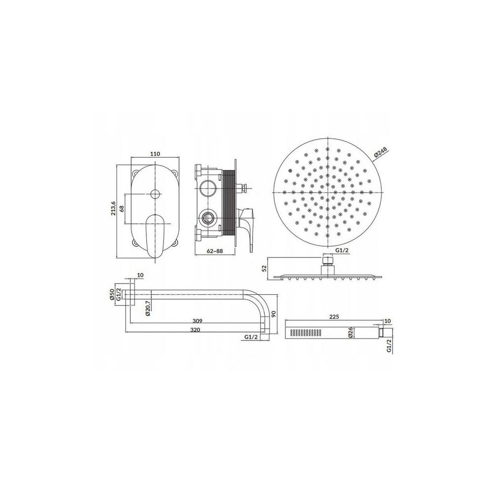 - sprchová hlavice (0,2 cm) o průměru 25 cm vyrobená z nerezavějící oceli