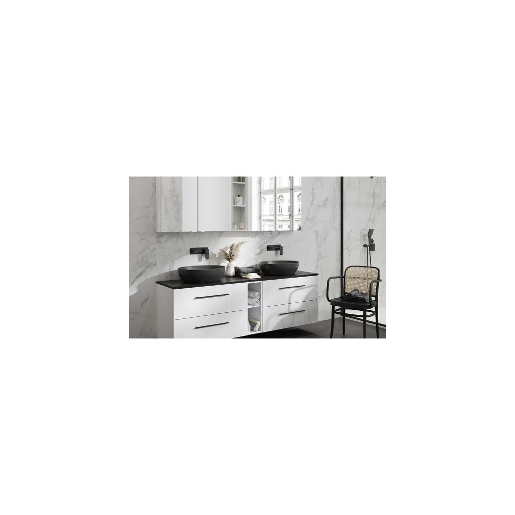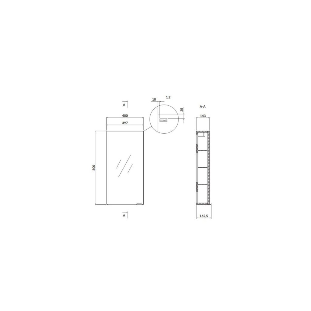 Horní zrcadlová skříňka z laminované dřevotřískové desky a se stříbrnou úchytkou. Uvnitř jsou 3 skleněné police a panty jsou s měkkým dovíráním. Dřevotřísková deska použitá ve skříni má certifikát FSC MIX CREDIT SGSCH-COC-007574.