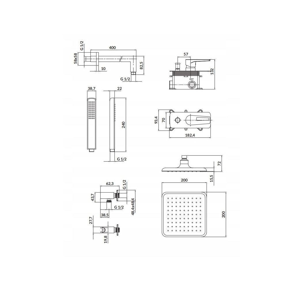 - Součástí balení: sprchová hlavice, hadice 150 cm, rukojeť, sprchový rám, dešťová sprcha