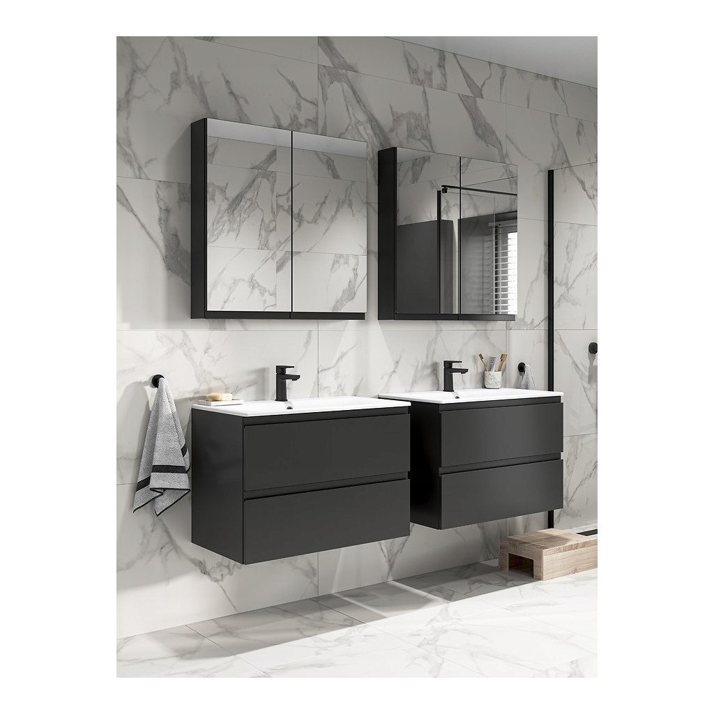 Sada skříňky a umyvadla MODUO SLIM určen do malých koupelen. Skříňka s univerzálním otevíráním dvířek pravá/ levá, je menší hloubky než standardní skříňky a je příkladem moderního koupelnového nábytku. Přední strana skříňky je vyrobena z MDF, lakovaná v antracitové barvě. Skříňka má pohodlné, frézované rukojeti a tichý systém zavírání dveří. Součástí je malé umyvadlo řady MODUO SLIM .
