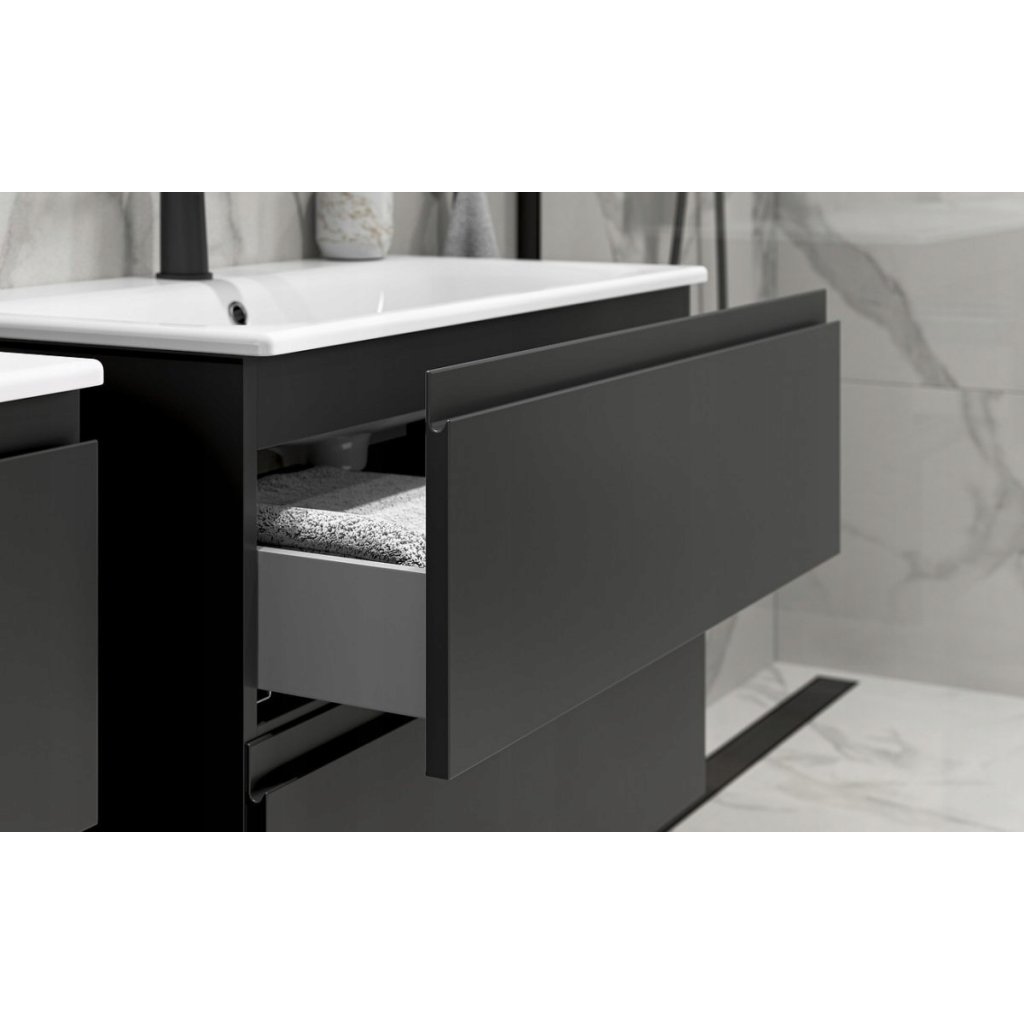 Souprava obsahuje umyvadlovou skříňku MODUO v provedení pro vlastní montáž a zapuštěné umyvadlo na pracovní desce MODUO 60. Přední strana skříňky je vyrobena z MDF, lakovaná v antracitové barvě s matným povrchem. Skříňka má pohodlné, frézované rukojeti a systém tichého zavírání.