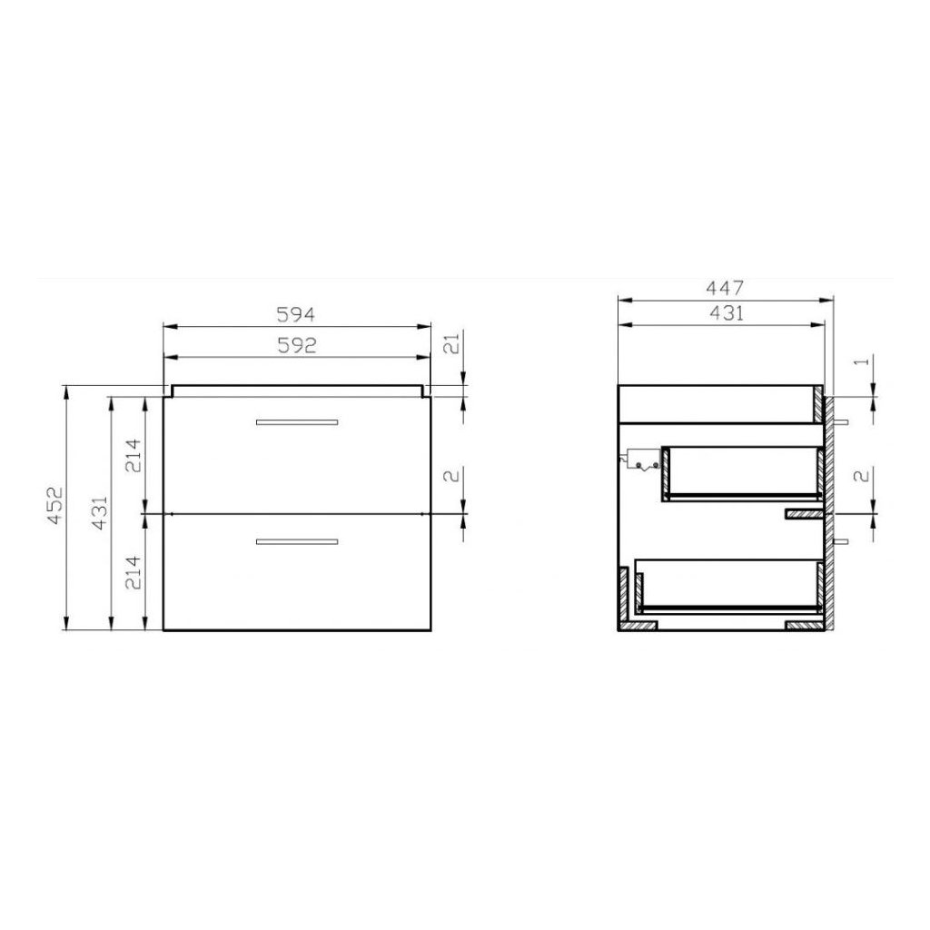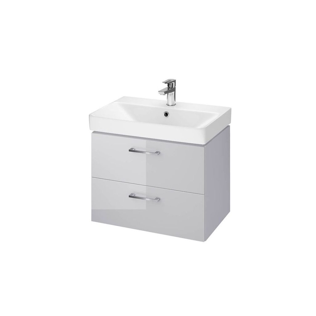 Závěsná skříňka v lesklém provedení se dvěma zásuvnaky se systémem měkkého zavírání, je doplněna chromovými madly, dodávána včetně keramického umyvadla.