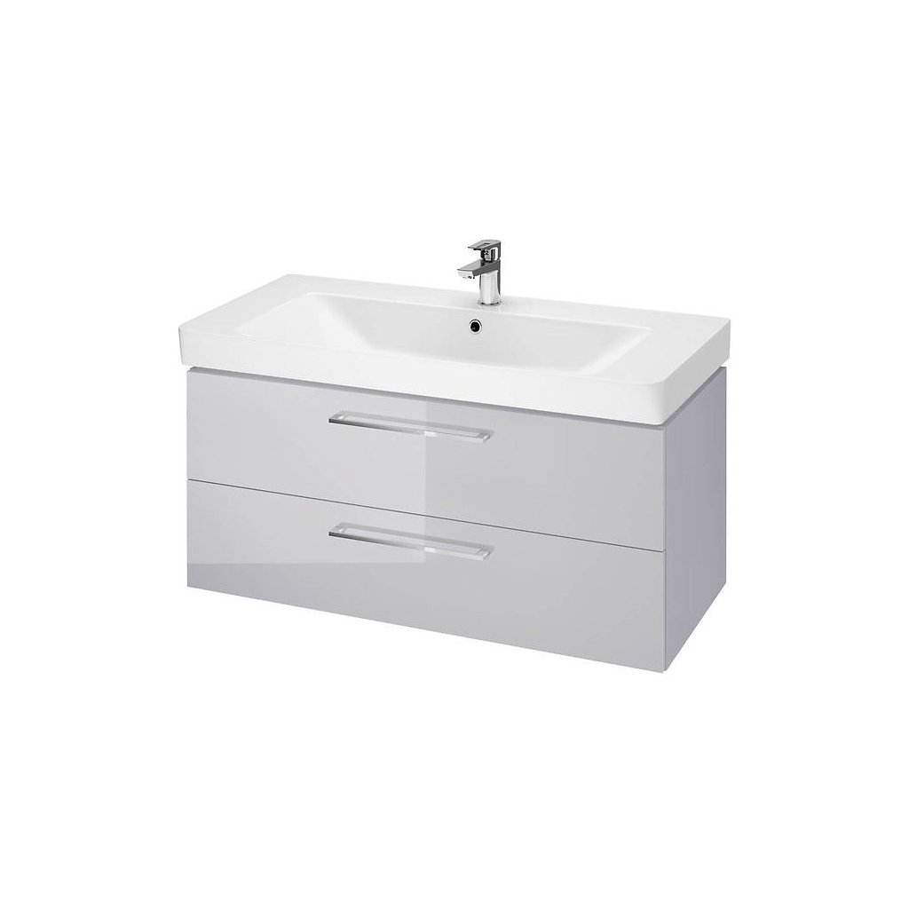 Závěsná skříňka v lesklém provedení se dvěma zásuvkami se systémem pomalého zavírání, je doplněna chromovými madly, dodávána včetně keramického umyvadla.