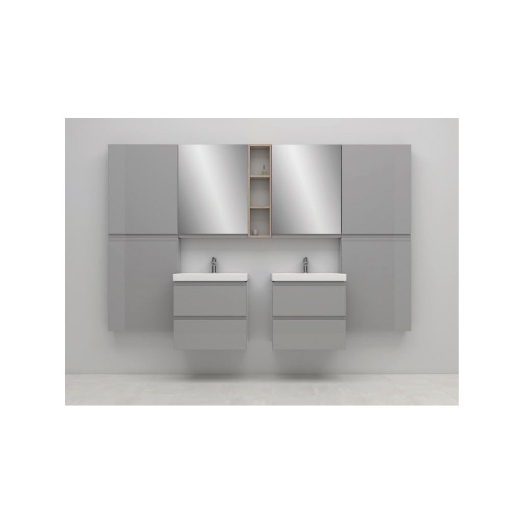 Kolekce MODUO SLIM je menší hloubky než standardní umyvadlový set a je příkladem moderního koupelnového nábytku. Přední části zásuvek se skrytými úchyty a tělo skříňky je pokryto lesklým šedým lakem, umyvadlo je s přepadem a otvorem pro baterii. Zásuvky jsou vybaveny tichým zavíracím systémem.