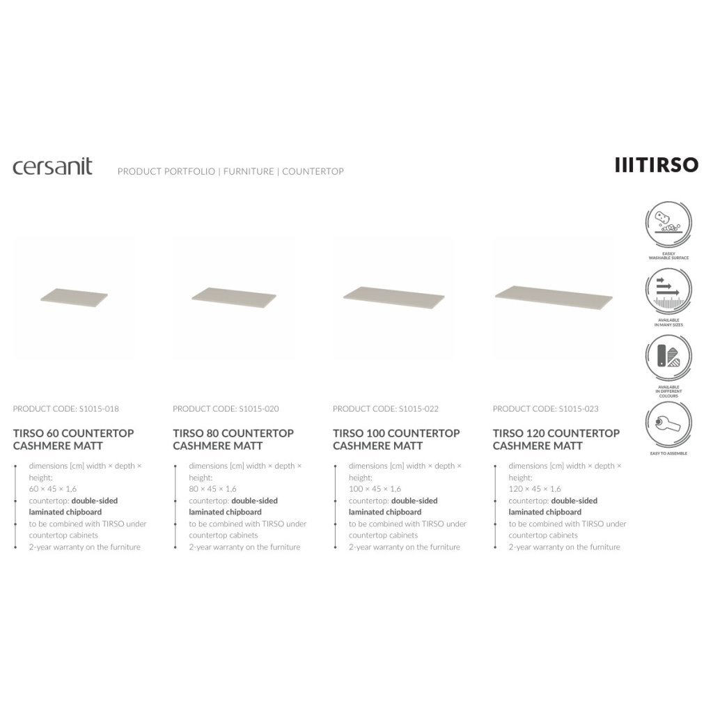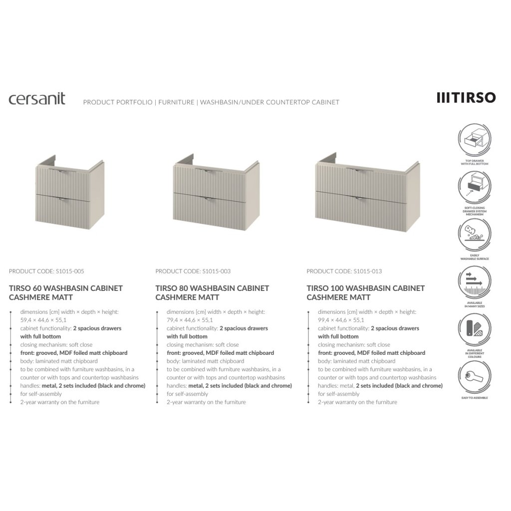 Kolekce koupelnového nábytku TIRSO představuje promyšlený koncept, který se díky kombinaci stylového designu a funkčních řešení stává ideálním návrhem pro ty, kdo hledají maximální pohodlí. Estetický koncept zachovaný v minimalistickém stylu umožní svobodu uspořádání v každé koupelně. Modularita nábytku umožní optimální hospodaření s prostorem, zatímco jemné žebrování vlnitých povrchů dodá interiéru jemnou expresivitu. Série TIRSO je dodávána v barevných variantách: bílá matná, kašmír matný, fjord a černá matná.