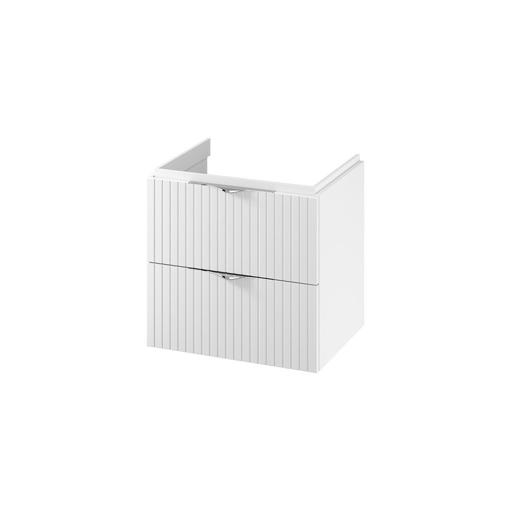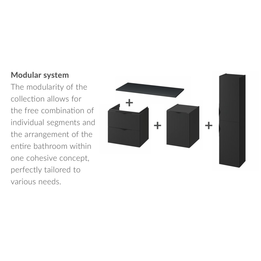 Skříňka je vybavena dvěma prostornými zásuvkami s plným dnem, které poskytují více úložného prostoru pro různé koupelnové doplňky – proto doporučujeme použít prostorově úsporný sifon. Mechanismus měkkého zavírání zaručuje tiché a hladké zavírání, což zvyšuje komfort používání. Přední strana skříňky je vyrobena z rýhované MDF desky foliované v matném provedení, což jí dodává jemnou texturu a elegantní vzhled. Tělo skříňky je laminovaná dřevotříska, také v matném provedení. Výrobek se perfektně hodí k nábytkovým umyvadlům, zapuštěným do pracovní desky, jakož ik umyvadlům na desku, takže se dá snadno přizpůsobit různým koupelnovým uspořádáním. Sada navíc obsahuje dvě sady kovových rukojetí (černá a chromová), které vám umožňují přizpůsobit vzhled skříňky preferencím uživatele. Skříňka je určena pro vlastní montáž, což umožňuje jednoduchou personalizaci a přizpůsobení.