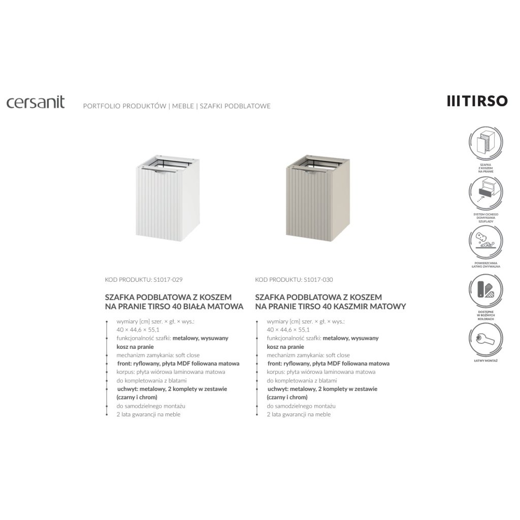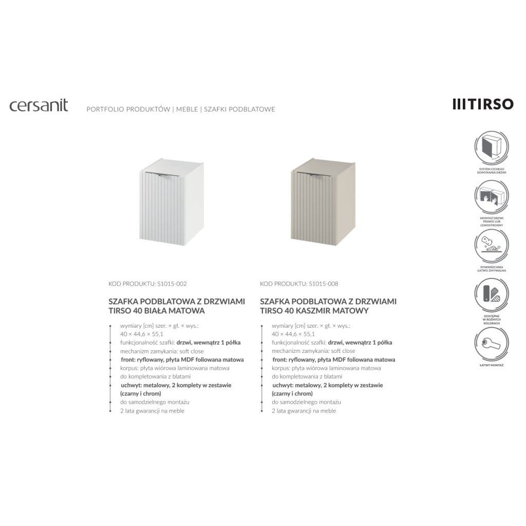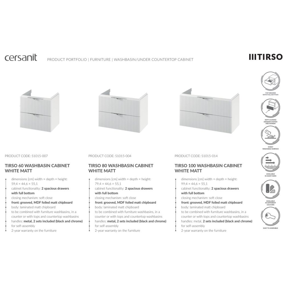 Kolekce koupelnového nábytku TIRSO představuje promyšlený koncept, který se díky kombinaci stylového designu a funkčních řešení stává ideálním návrhem pro ty, kdo hledají maximální pohodlí. Estetický koncept zachovaný v minimalistickém stylu umožní svobodu uspořádání v každé koupelně. Modularita nábytku umožní optimální hospodaření s prostorem, zatímco jemné žebrování vlnitých povrchů dodá interiéru jemnou expresivitu. Série TIRSO je dodávána v barevných variantách: bílá matná, kašmír matný, fjord a černá matná.