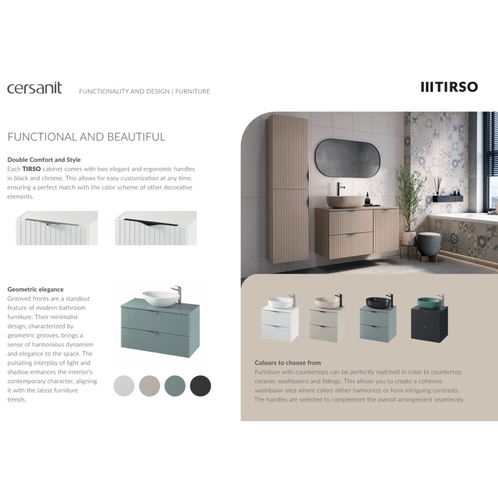 Kolekce koupelnového nábytku TIRSO představuje promyšlený koncept, který se díky kombinaci stylového designu a funkčních řešení stává ideálním návrhem pro ty, kdo hledají maximální pohodlí. Estetický koncept zachovaný v minimalistickém stylu umožní svobodu uspořádání v každé koupelně. Modularita nábytku umožní optimální hospodaření s prostorem, zatímco jemné žebrování vlnitých povrchů dodá interiéru jemnou expresivitu. Série TIRSO je dodávána v barevných variantách: bílá matná, kašmír matný, fjord a černá matná.