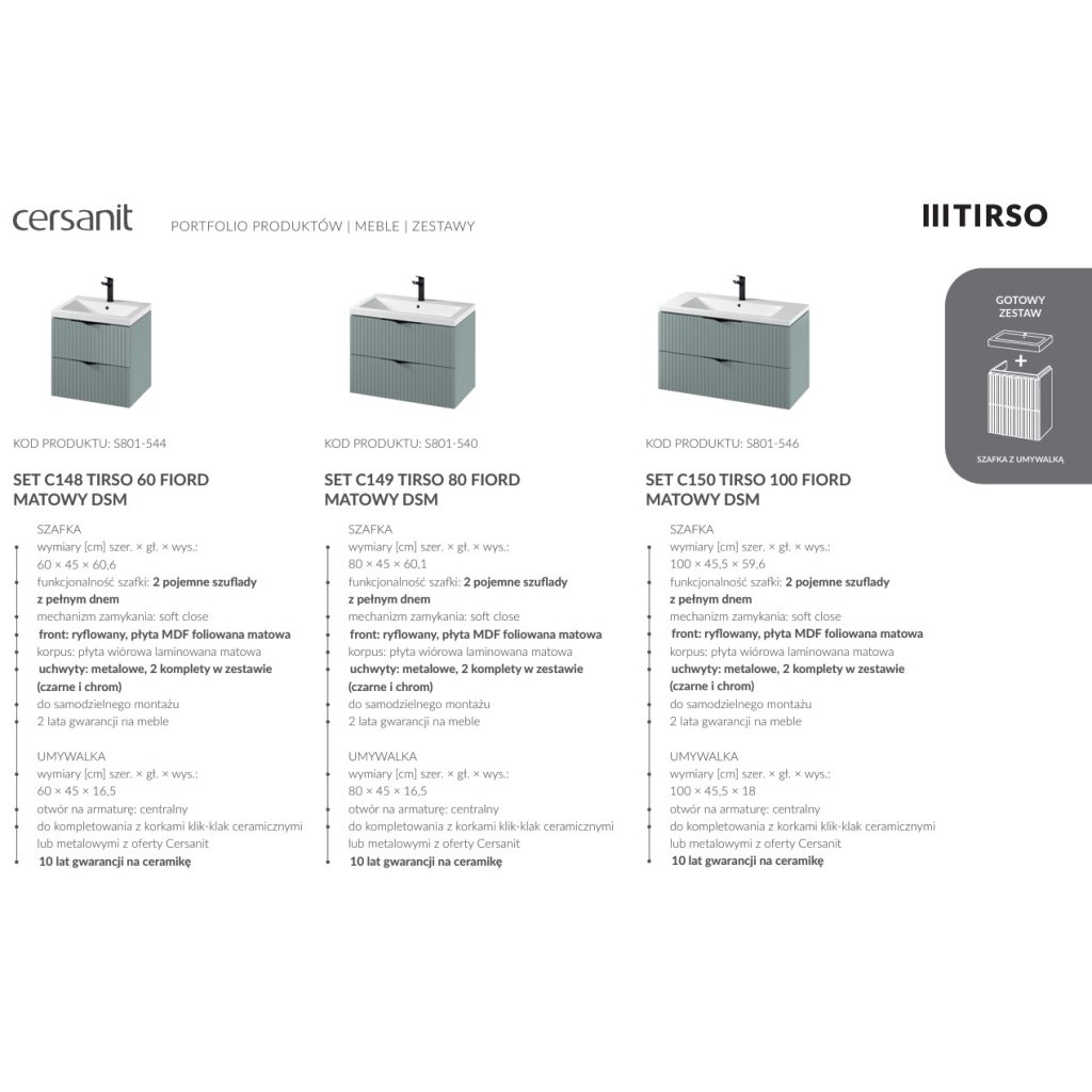 Souprava obsahuje skříňku pod umyvadlo TIRSO 80 ve verzi DSM (demont – vlastní montáž) a keramické umyvadlo Cersanit Como 80. Skříňka je vybavena dvěma prostornými zásuvkami s plným dnem, které poskytují více úložného prostoru pro různé koupelnové doplňky – proto doporučujeme použít prostorově úsporný sifon. Přední strana skříňky je vyrobena z rýhované foliované MDF desky v matném provedení, což jí dodává jemnou texturu a elegantní vzhled. Tělo skříňky je laminovaná dřevotříska, také v matném provedení. Obdélníkové keramické umyvadlo COMO 80 má otvor pro vodovodní baterii a přepadový otvor ve střední části, lze jej doplnit keramickými nebo kovovými zátkami click-clack z nabídky Cersanit.