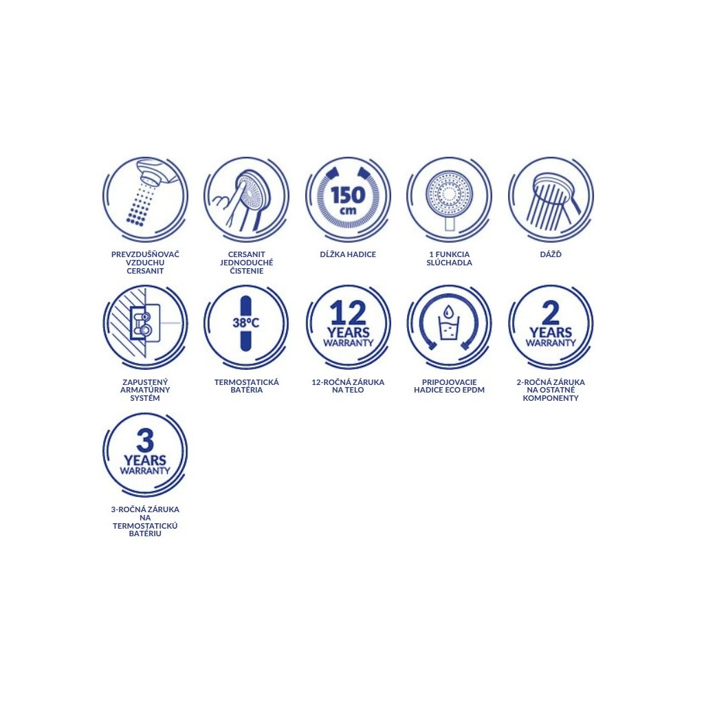 - Záruka: 12 let na mosazné tělo baterie, 3 roky na těsnost termostatické kartuše, 2 roky na ostatní díly