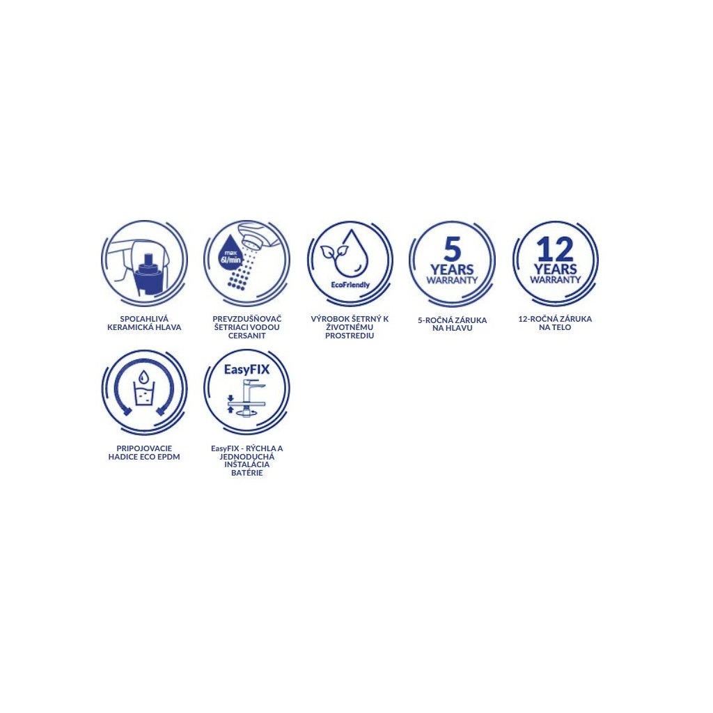 Série ZEN se vyznačuje dokonalou kombinací harmonických tvarů se špičkovým designem, které každému přinesou uklidňující auru do interiéru – bez ohledu na styl nebo velikost. Zajímavým stylistickým doplňkem celé kolekce ZEN jsou moderní páky baterií zakončené rýhovaným povrchem. Jednopáková umyvadlová baterie z kolekce ZEN je vybavena ekologickým provzdušňovačem Cersanit Water Save a 25 mm keramickou hlavou, která umožňuje plynulou regulaci vodního proudu. Ekologický provzdušňovač Cersanit Water Save provzdušňuje proud vody, což zvyšuje jeho objem a omezuje odtok vody na 6 l/min. To vám umožní získat silný, silný proud bez maximálního uvolnění páky baterie. Baterie je také vybavena flexibilními připojovacími hadicemi Eco EPDM o délce 60 cm a průměrem G 3/8 palce. Hadice jsou certifikovány WRAS, což potvrzuje jejich vysokou kvalitu. Vnitřní okraj hadic vyplňuje speciální povlak tak, aby voda nezměnila chuť a vůni. Na výrobek se vztahuje 12letá záruka na tělo baterie a 5letá záruka na těsnost kartuše.