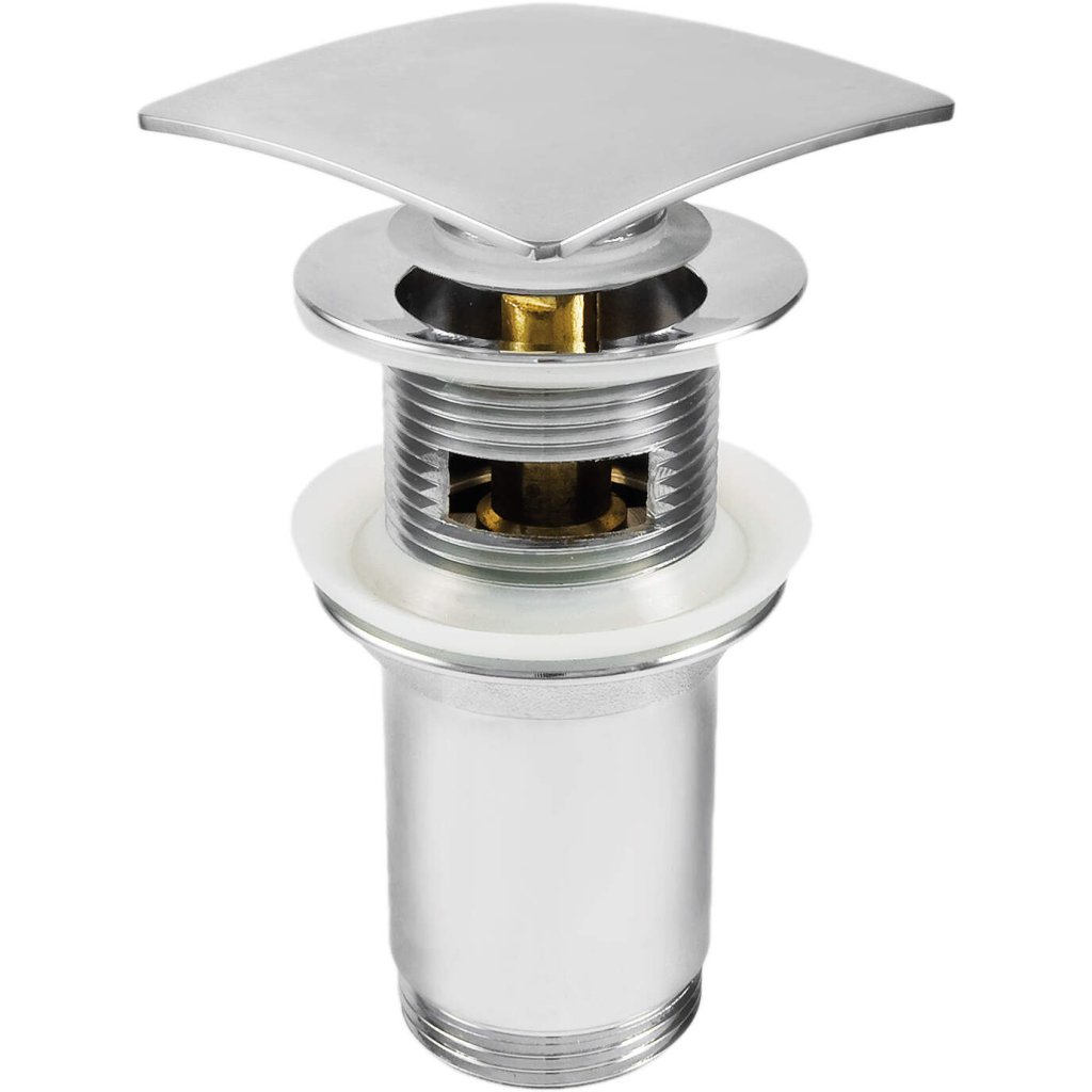 Mosazná zátka click-clack má originální čtvercový tvar. Pohodlný systém umožňuje zavřít nebo otevřít odtok jedním stisknutím.