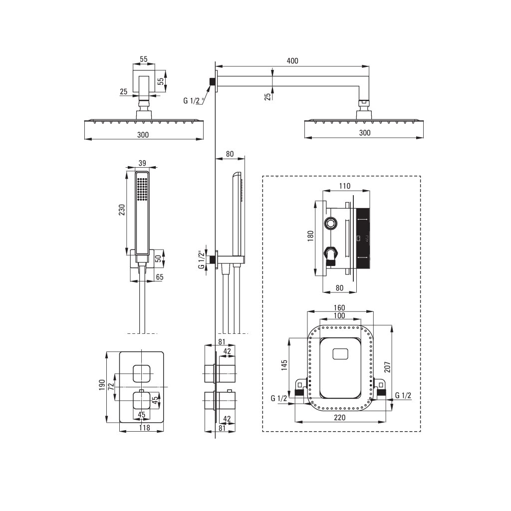Sprchová souprava namontovaná pro splachování se skládá z termostatické baterie, obdélníkové stříkací hlavy a sluchátka s optimálním dešťovým proudem a anti-calc systému, který zabraňuje ukládání vodního kamene. Zakoupením sady si můžete být jisti, že všechny prvky do sebe dokonale zapadnou. Instalace namontovaná pro splachování poskytuje estetický a minimalistický vzhled, v chromové úpravě se vejde do klasického i moderního uspořádání.