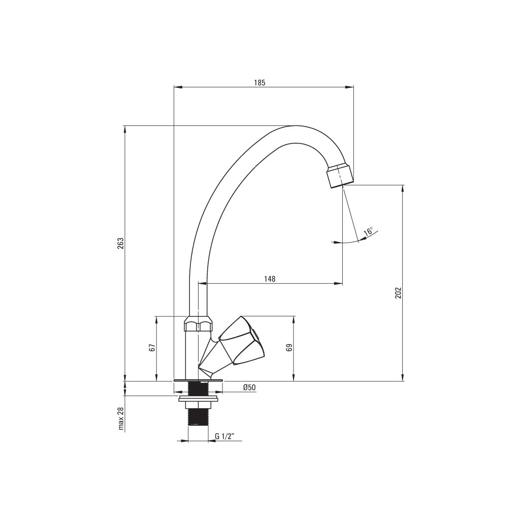 - Typ: stojánková umyvadlová baterie na studenou vodu s výlevkou ve tvaru "F"