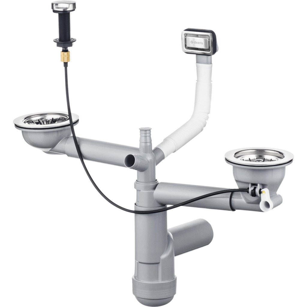 - Typ: úsporný sifon pro 1,5 a 2-komorové dřezy s automatickou zátkou a logem Deante