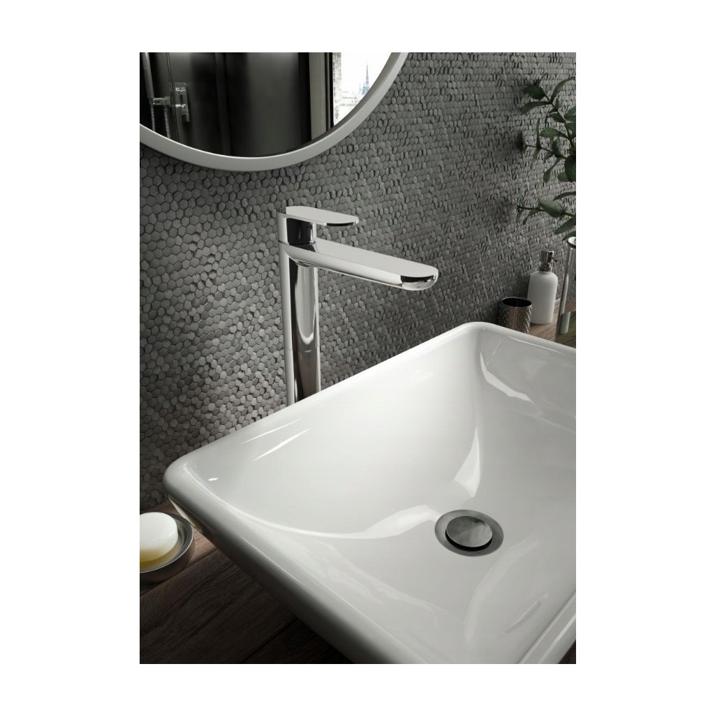 Umyvadlová baterie se zvednutým tělem z komplexní kolekce Alpinia (protože obsahuje až 20 koupelnových výrobků) je mimořádně efektivním a moderním návrhem, který bude fungovat v moderních aranžmá lázeňského salonu - minimalistickém i inspirovaném přírodou. Jeho charakteristickým znakem – kromě elegantně zaoblených linií a úhlů je plochá, příjemná pro dotykovou plochu páky a výtoku. Vyvýšené tělo a výtok s rozsahem více než 16 cm dělají tuto baterii skvělou v kombinaci s módními umyvadly na desce. Zde prezentovaná baterie s vysokým umyvadlem Alpinia je rovněž vybavena zátkou na klik a provzdušňovačem, který provzdušňuje potok a snižuje spotřebu vody.