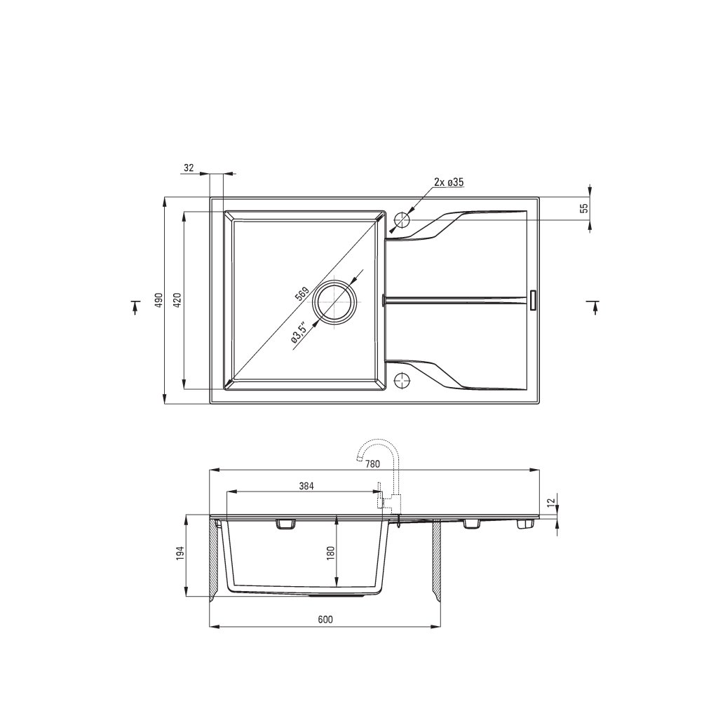 - Rozměry dřezu: 780 x 490 x 194 mm