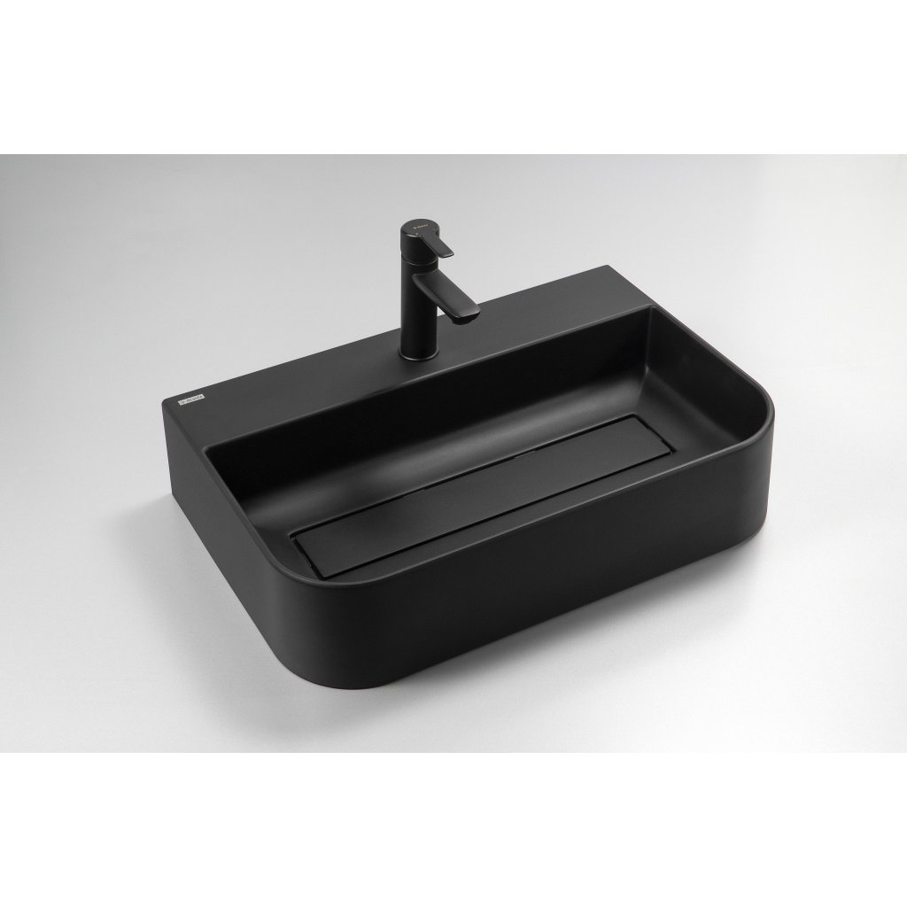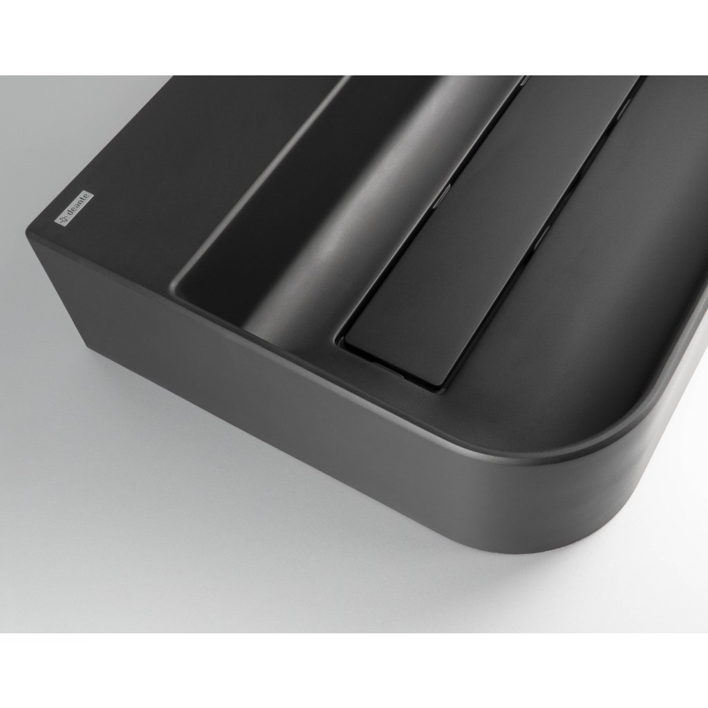 Žulové umyvadlo s černou přepadovou mřížkou se vyznačuje moderním a elegantním designem. Na přední straně má zaoblené hrany, což mu dodává měkký, estetický vzhled a zvyšuje komfort používání. Je vyroben ze žuly Deante, je odolný vůči nárazům, vysokým teplotám, změně barvy a tepelnému šoku. Díky svým hydrofobním vlastnostem odpuzuje molekuly vody, což usnadňuje udržování čistoty. Povrch umyvadla je obohacen o ionty stříbra, které poskytují antiseptický účinek. Žulová přepadová mřížka, přesně sladěná s umyvadlem, zdůrazňuje eleganci a konzistenci celé formy.