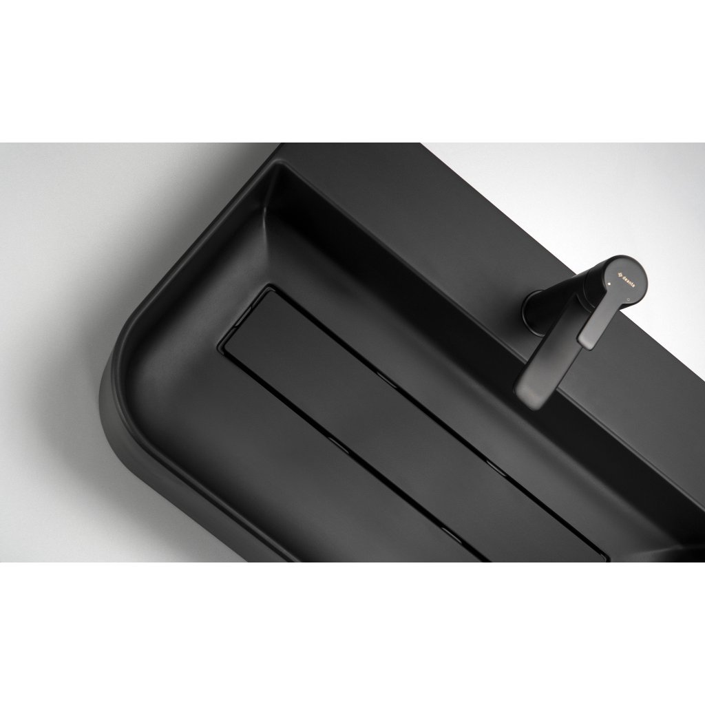 Granitové umyvadlo s černou přepadovou mřížkou se vyznačuje moderním a elegantním designem. Na přední straně má zaoblené hrany, což mu dodává měkký, estetický vzhled a zvyšuje komfort používání. Je vyroben ze žuly Deante, je odolný vůči nárazům, vysokým teplotám, změně barvy a tepelnému šoku. Díky svým hydrofobním vlastnostem odpuzuje molekuly vody, což usnadňuje udržování čistoty. Povrch umyvadla je obohacen o ionty stříbra, které poskytují antiseptický účinek. Žulová přepadová mřížka, přesně sladěná s umyvadlem, zdůrazňuje eleganci a konzistenci celé formy.