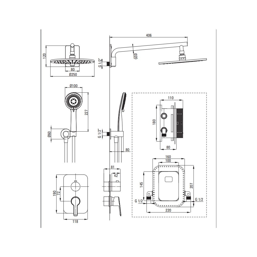 - Typ: sprchová souprava pod omítku s dešťovou hlavovou sprchou a ruční sprchou
