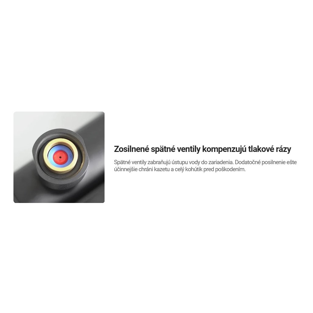 Zpětné ventily zabraňují ústupu vody do zařízení. Dodatečné posílení ještě účinněji chrání kazetu a celý kohoutek před poškozením.