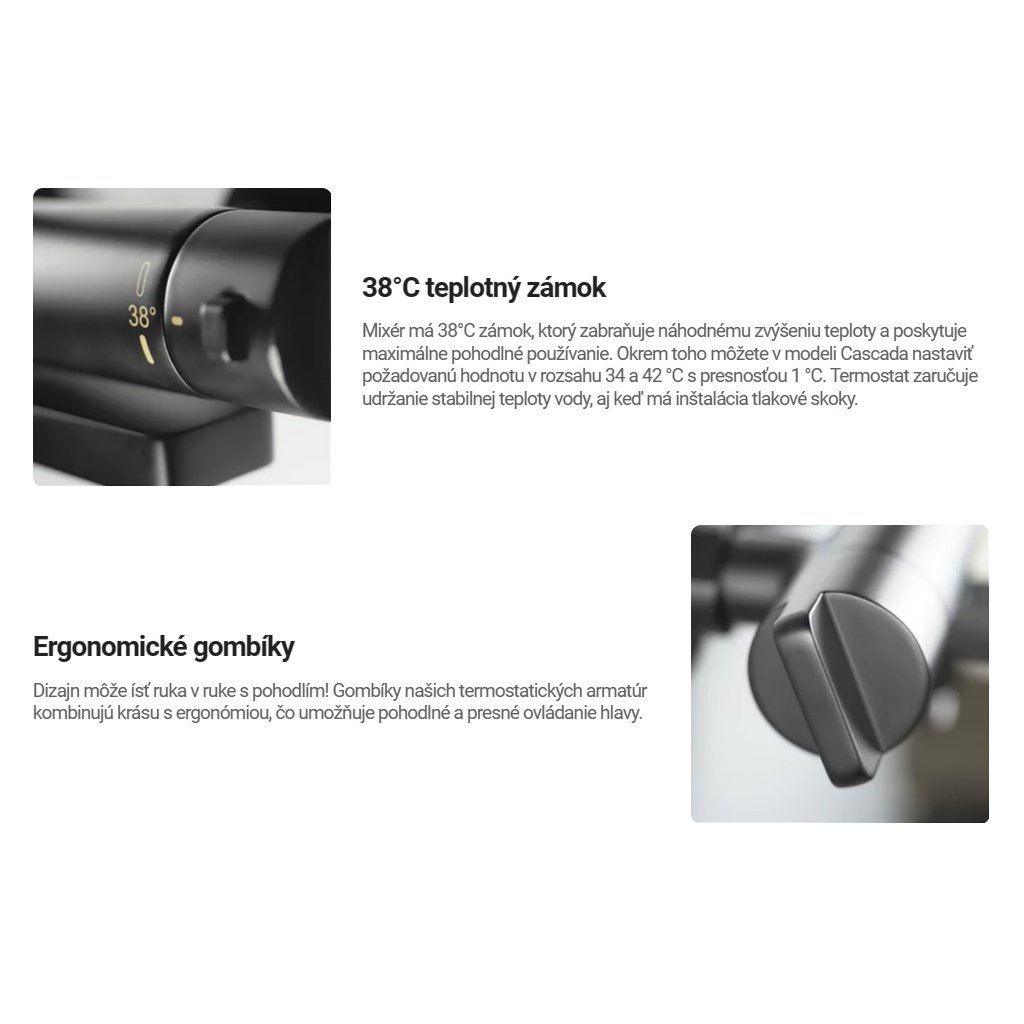 Baterie má 38°C zámek, který zabraňuje náhodnému zvýšení teploty a poskytuje maximálně pohodlné používání. Kromě toho můžete v modelu Cascada nastavit požadovanou hodnotu v rozsahu 34 a 42 °C s přesností 1 °C. Termostat zaručuje udržení stabilní teploty vody, i když má instalace tlakové skoky.