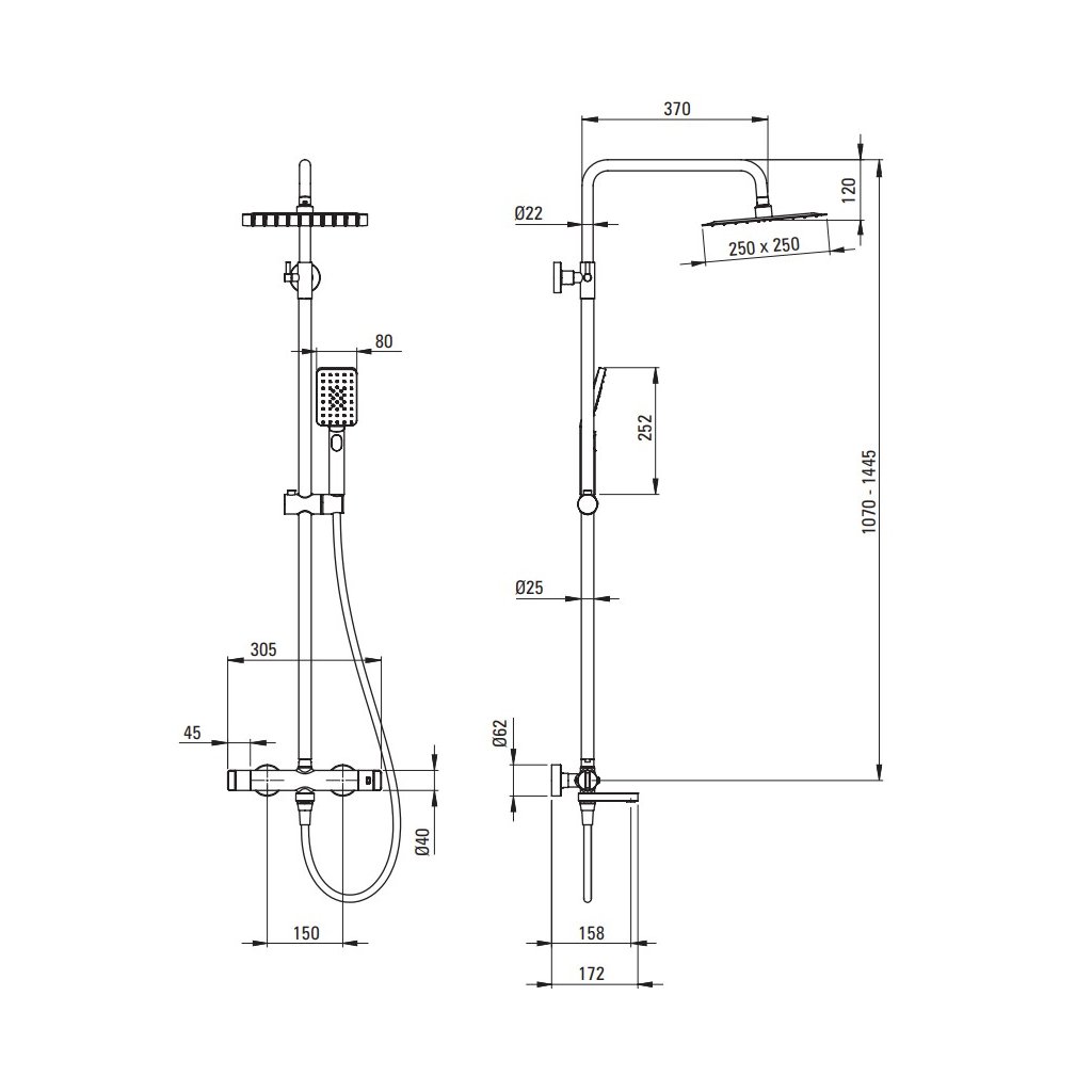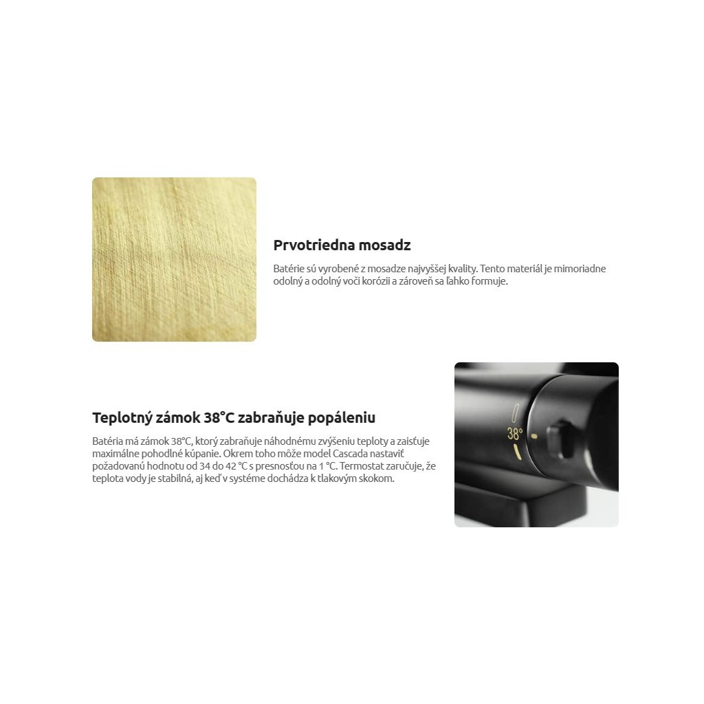 Cascada dešťová sprchová souprava s termostatickou vanovou baterií je designový a zároveň velmi bezpečný a promyšlený produkt. Dešťová sprcha má baterii se skládacím výtokem, který slouží také jako sprchový přepínač. Teplotní zámek 38 stupňů zabraňuje náhodnému popálení a zajišťuje maximálně pohodlné koupání. Ergonomické knoflíky kromě dekorativní funkce umožňují přesné ovládání těla baterie. Ultratenká sprchová hlavice a 3-funkční ruční hlavice jsou vybaveny Anti-Calc systémem, který zabraňuje hromadění vodního kamene a tím prodlužuje životnost produktu. To vše činí dešťovou sprchu Cascada, kromě jejího skvělého vzhledu, také mimořádně funkční.