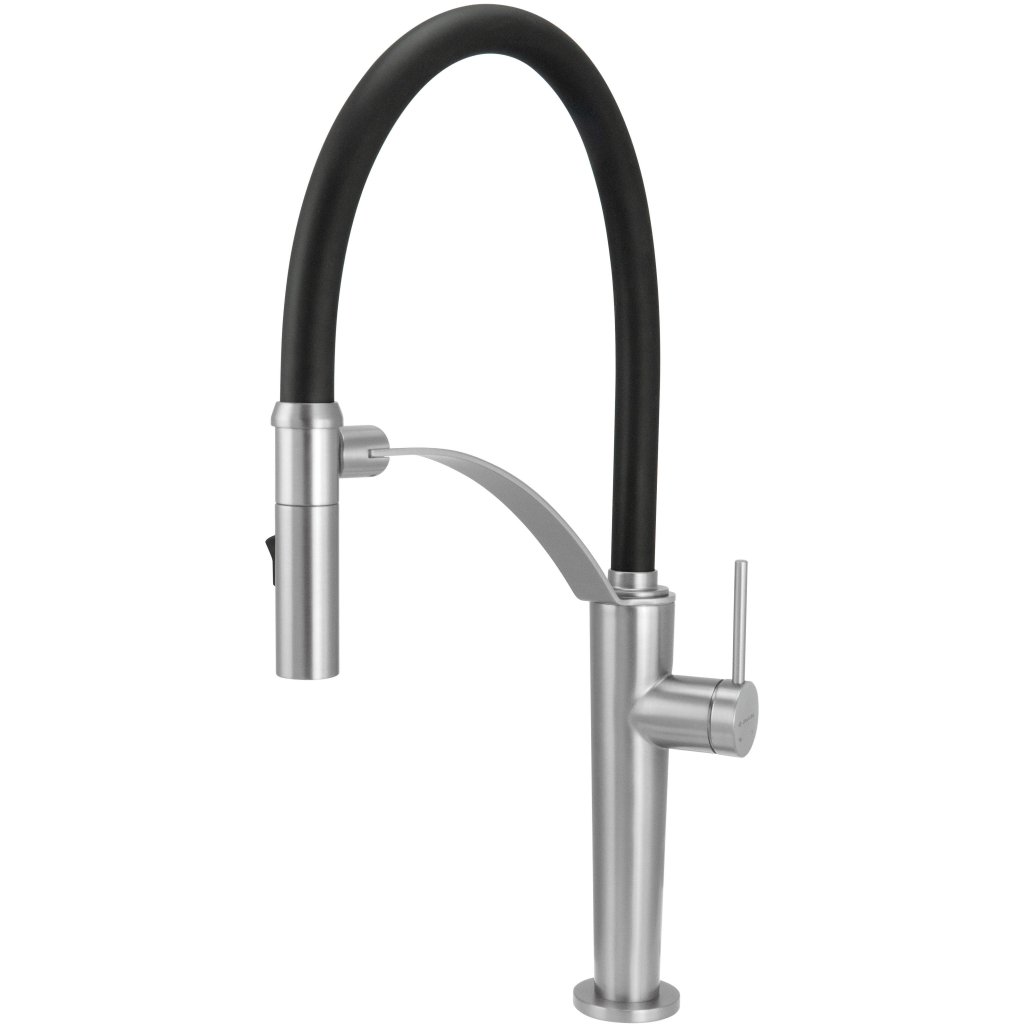Kuchyňská baterie Corda je praktická a elegantní volba. Flexibilní výtok vám umožní snadno mýt nádobí a udržovat kuchyňský dřez čistý. Díky magnetické rukojeti je výtok vždy na svém místě. Dvoufunkční sprchová hlavice umožňuje změnit proud z provzdušněného na deštivý, což zvyšuje komfort používání a funkčnost baterie. Povrchová úprava z broušené oceli je odolná vůči otiskům prstů a snadno se udržuje v čistotě, díky čemuž baterie vypadá moderně a esteticky. Jeho design se perfektně hodí k řadě granitových dřezů Corda.