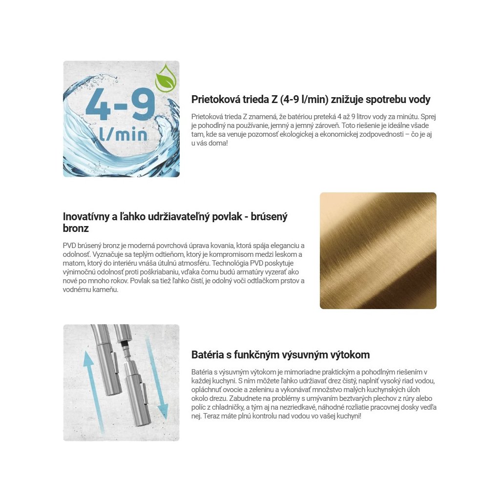 Baterie Eridan je symbolem elegance a inovace ve vaší kuchyni. Je vyroben z nejkvalitnější oceli a zaujme štíhlým tělem, které plynule expanduje směrem dolů. Jeho moderní design se perfektně hodí k různým interiérům a dodává jim jedinečný styl. Zabudovaný provzdušňovač provzdušňuje proud vody, což zajišťuje hospodárnost a pohodlí každodenního používání. Eridan je víc než jen tradiční kuchyňská baterie – je to ekologické řešení, které pečuje o vaše zdraví a planetu. Díky jedinečnému připojení k vodnímu filtru snadno získáte čistou, filtrovanou vodu stisknutím tlačítka Click na konci výtoku. Speciální hadice uvnitř výtoku vede vodu přímo z filtru, což zaručuje jeho nejvyšší kvalitu. Povrchová úprava z broušeného bronzu dodává kuchyni hřejivý a moderní nádech. Baterie se perfektně hodí ke žulovému dřezu ze série Eridan.