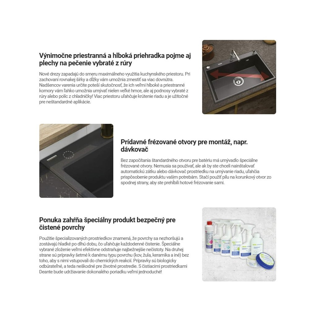 - Vlastnosti granitu Deante: odolnost proti nárazu, vysoké teplotě, změně barvy, tepelnému šoku
