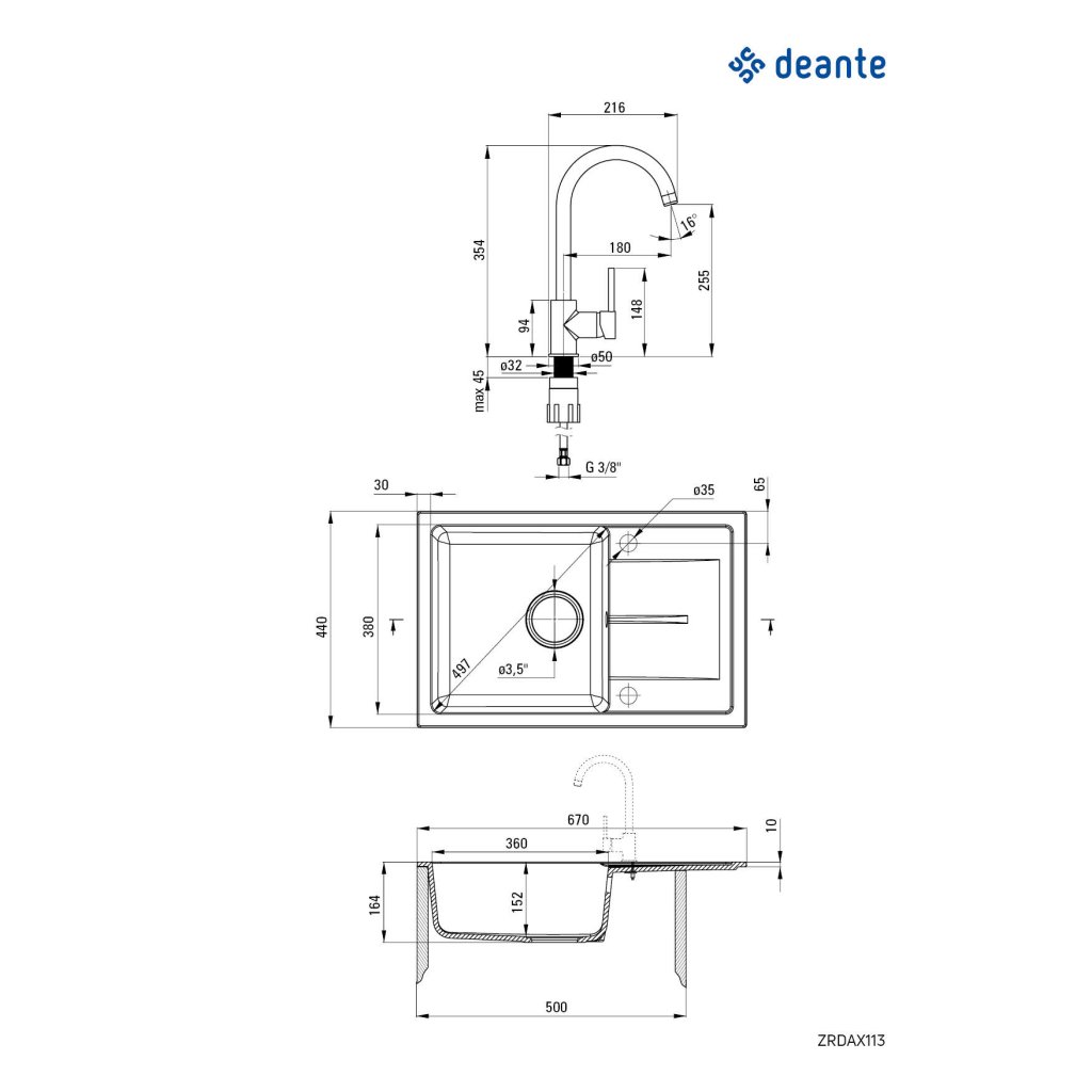 Deante Leda, granitový 1-komorový dřez na desku 670x440x164 mm + dřezová baterie BEN 262M grafitová + sifon, grafitová, ZRDA2113