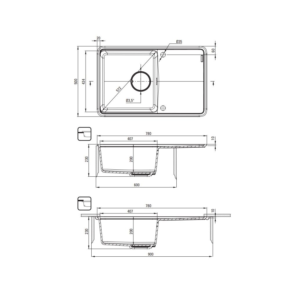 - Průměr odtoku: 3.5''