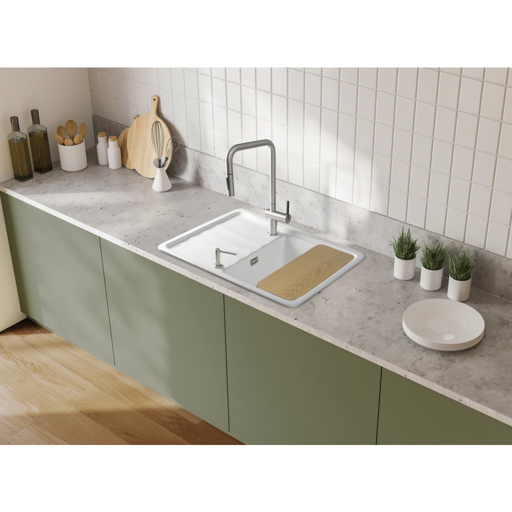 Keramický dřez Deante Momi je elegantní a praktické řešení pro moderní kuchyni. Díky kvalitnímu keramickému materiálu nabízí výjimečnou odolnost vůči vysokým teplotám, poškrábání i náhlým teplotním změnám. Keramika si dlouhodobě zachovává bílou barvu, povrchovou hladkost a luxusní vzhled. Dřez je jednokomorový a doplněný o integrovaný odkapávač, který poskytuje prostor pro sušení nádobí či přípravu potravin. Hladký povrch se snadno čistí a přispívá k vysoké hygieně v kuchyni. Díky velké a hluboké míse nabízí dostatek prostoru také pro větší nádoby.