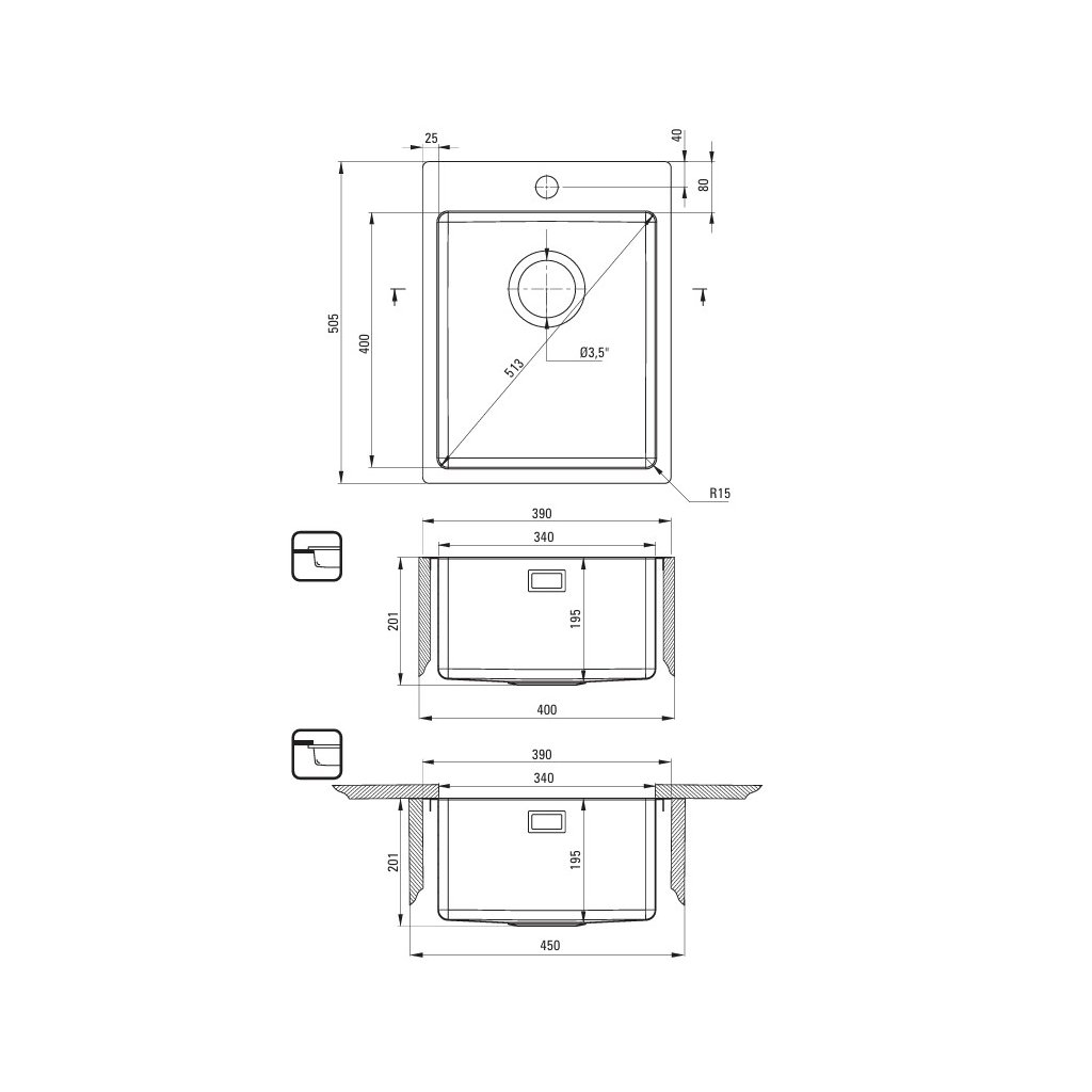 - Způsob montáže: v jedné rovině s deskou, zapuštěný, podpultový