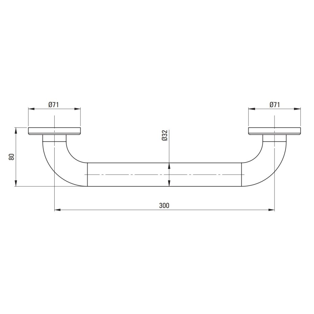 Držák na zeď vyrobený z nerezavějící oceli o délce 30 cm. Rozety o průměru 71mm vyrobeny z chromovaného plastu. Včetně montážní soupravy na tvrdý podklad (plné cihlové/betonové stěny). Maximální nosnost 150 kg. Výrobek je zdravotnická pomůcka.