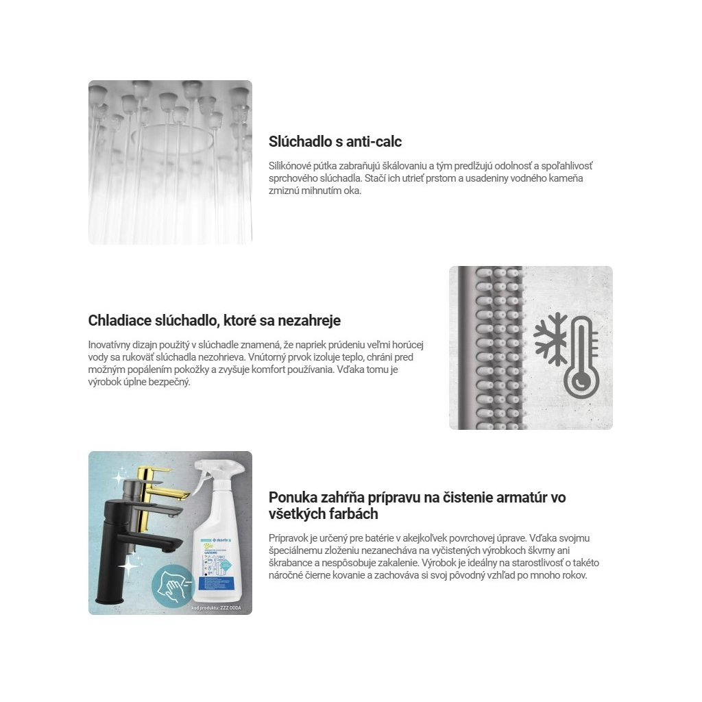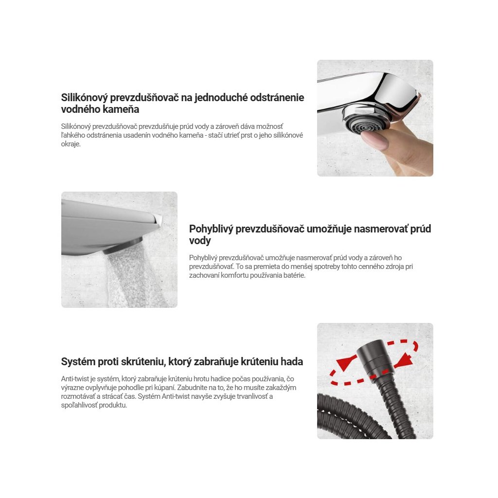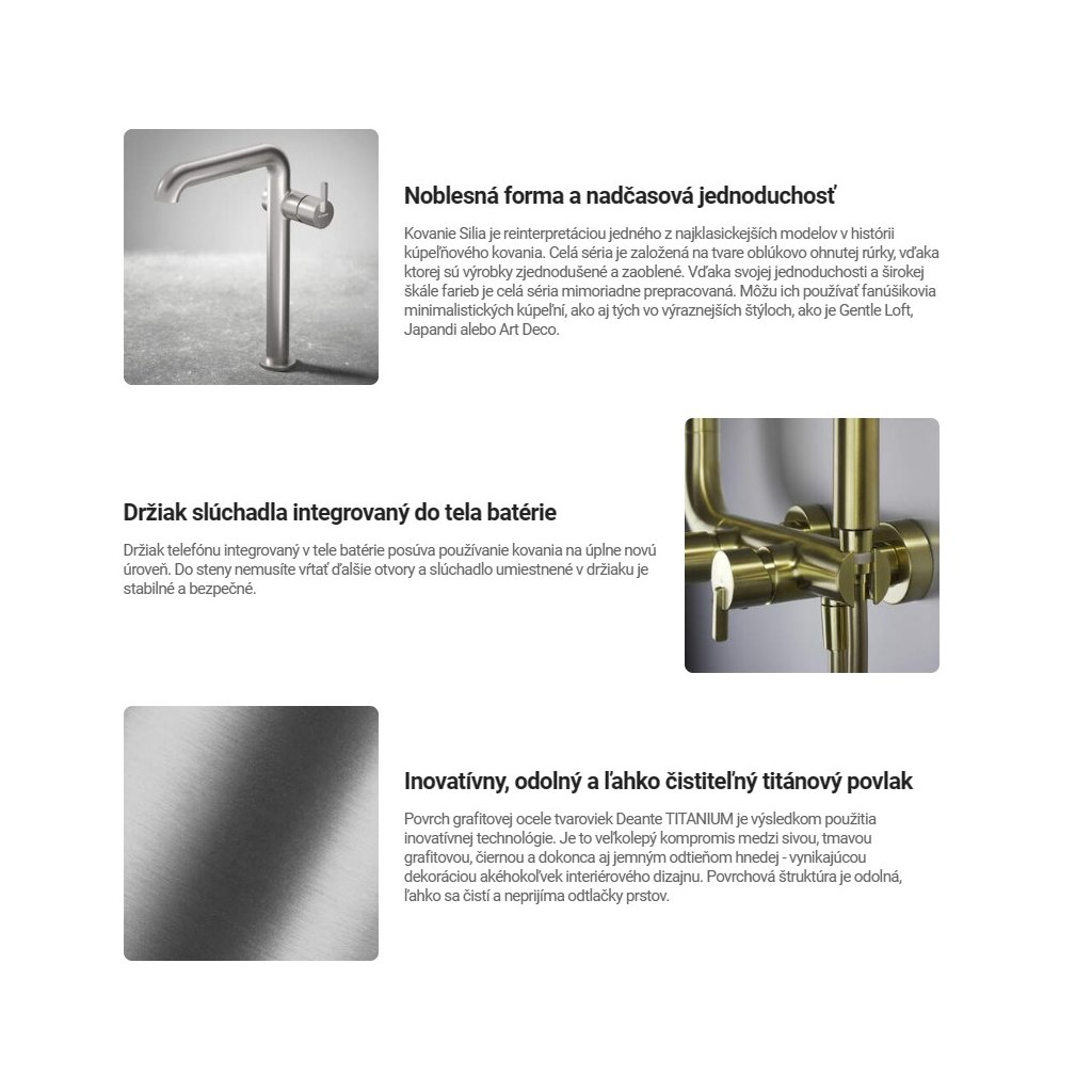 Vanová baterie kombinuje estetický vzhled a funkčnost. Tradiční tvary se dobře hodí do malých koupelen i velkých koupelen. Odolné tělo je vyrobeno z nejkvalitnější mosazi. Snadno se čistí a zabraňuje nadměrnému tvorbě vodního kamene. Vanová baterie je také vybavena provzdušňovačem. Zařízení rozbije kapky a provzdušňuje vodní proud. Díky tomu je voda měkčí při doteku s tělem. Souprava zahrnuje ruční sprchovou hlavici a sprchovou hadici. Kolekce Silia je široká škála produktů: od vodovodních baterií, přes sprchy, keramiku a doplňky. To, co charakterizuje celou linii, jsou čisté linie a světlé tvary. Navzdory své minimalistické formě je mimořádně funkční. Příslušenství dokonale skrývá montážní prvky, keramika zaujme tenkými hranami a dokonale hladkým povrchem a kování se vyznačuje extrémně plastickým tvarem. Celá kolekce Silia je dokonale rafinovaná a poskytuje maximální možnosti uspořádání. Každý prvek se navzájem doplňuje a vytváří koherentní a estetickou formu.