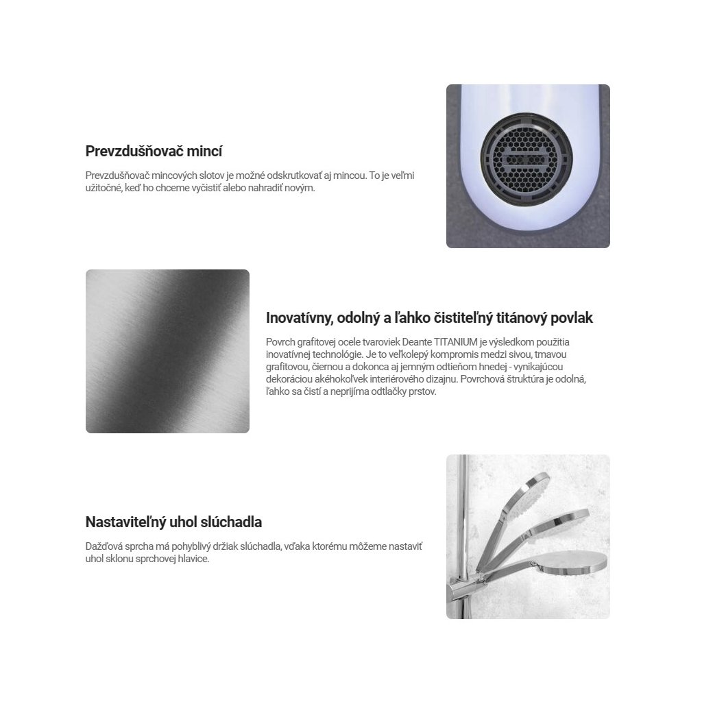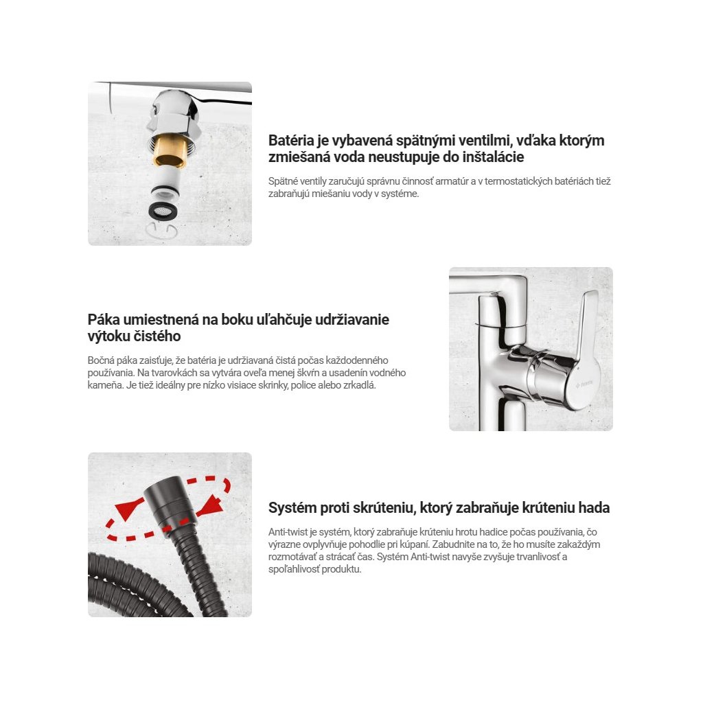 - Systém proti zkroucení sprchové hadice, který zabraňuje zkroucení hadice