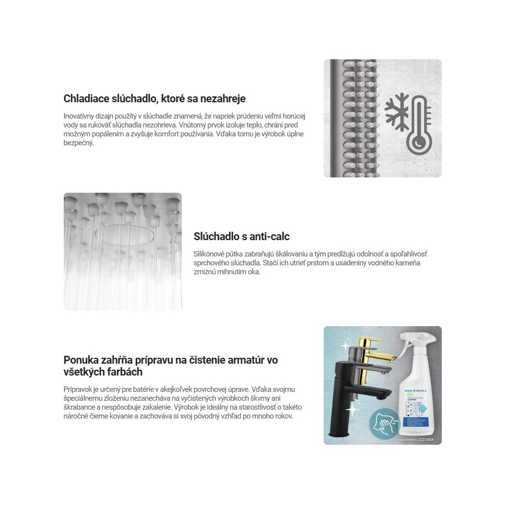 - Chladící ruční sprcha, které se nezahřeje a zabraňuje popálení při horké vodě