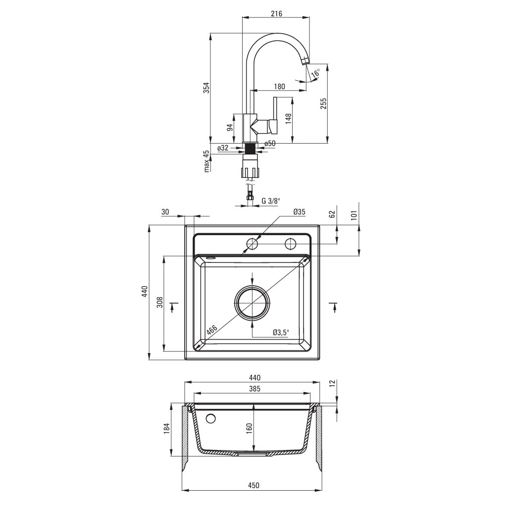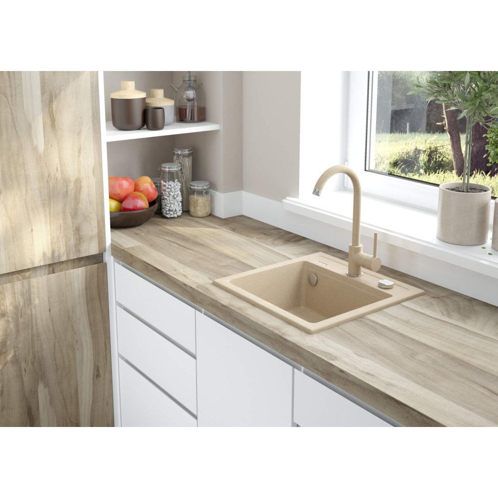 Deante Zorba, granitový dřez 440x440x184 mm B/O, 3,5" + prostorově úsporný sifon, 1-komorový + Nemezja baterie, písková, ZQZA7103
