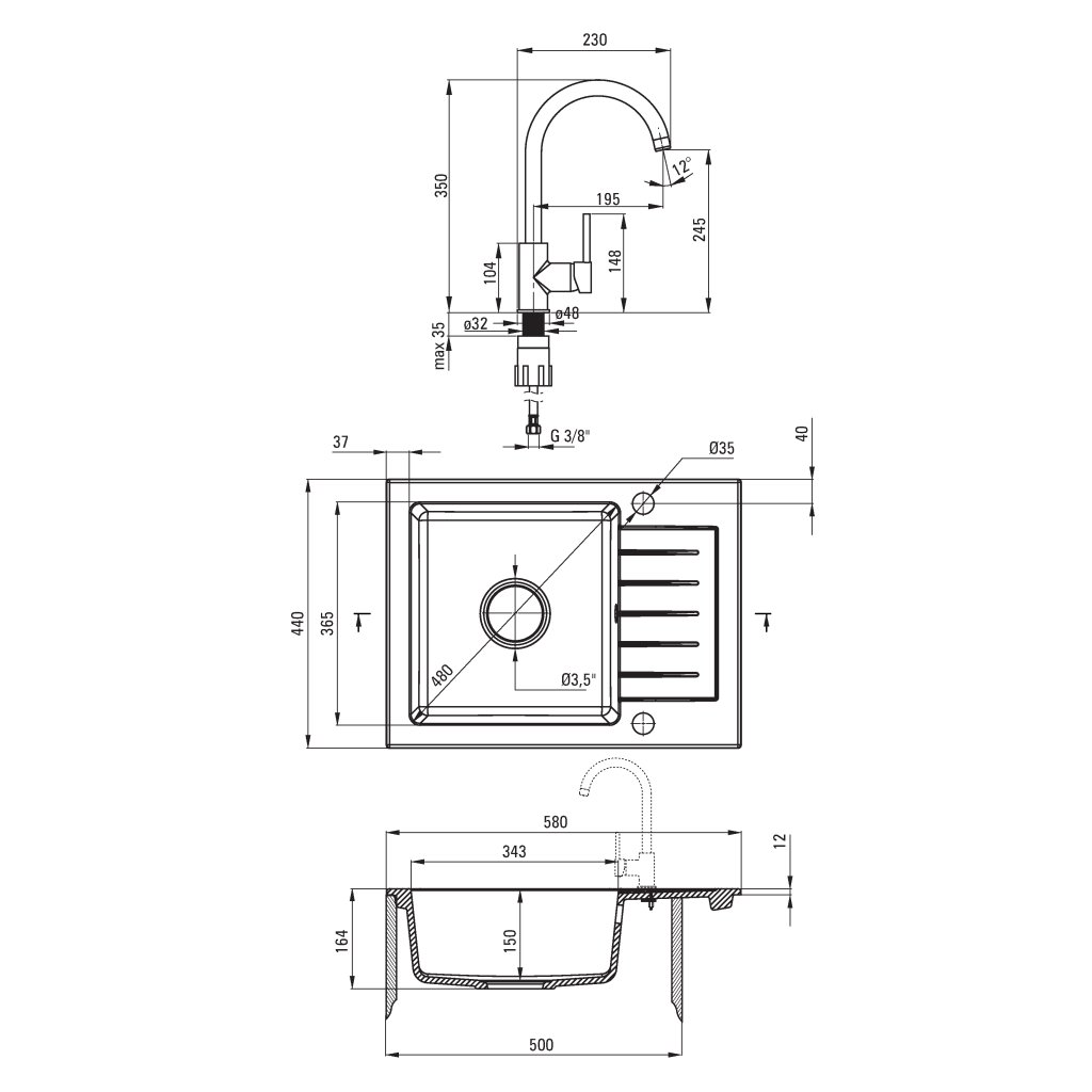 - Průměr odtoku: 3.5''