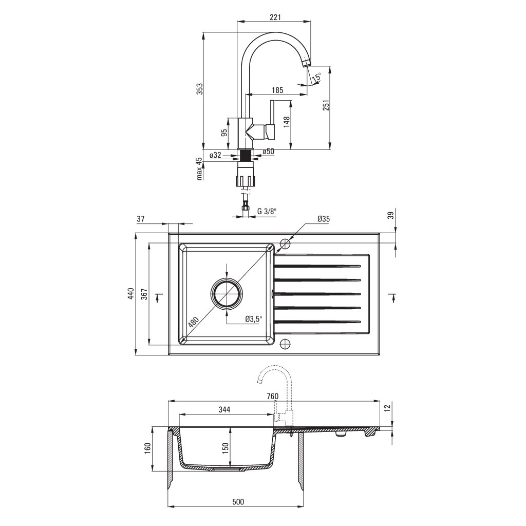 Deante Zorba, granitový dřez 760x440x160 mm Z/O, 3,5" + prostorově úsporný sifon, 1-komorový + Milin baterie, černá, ZQZVN113