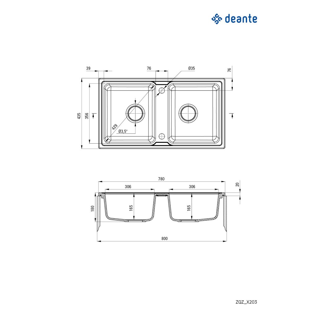 Deante Zorba, granitový dřez 780x435x180 mm B/O, 3,5" + prostorově úsporný sifon, 2-komorový, antracitová metalíza, ZQZ_T203