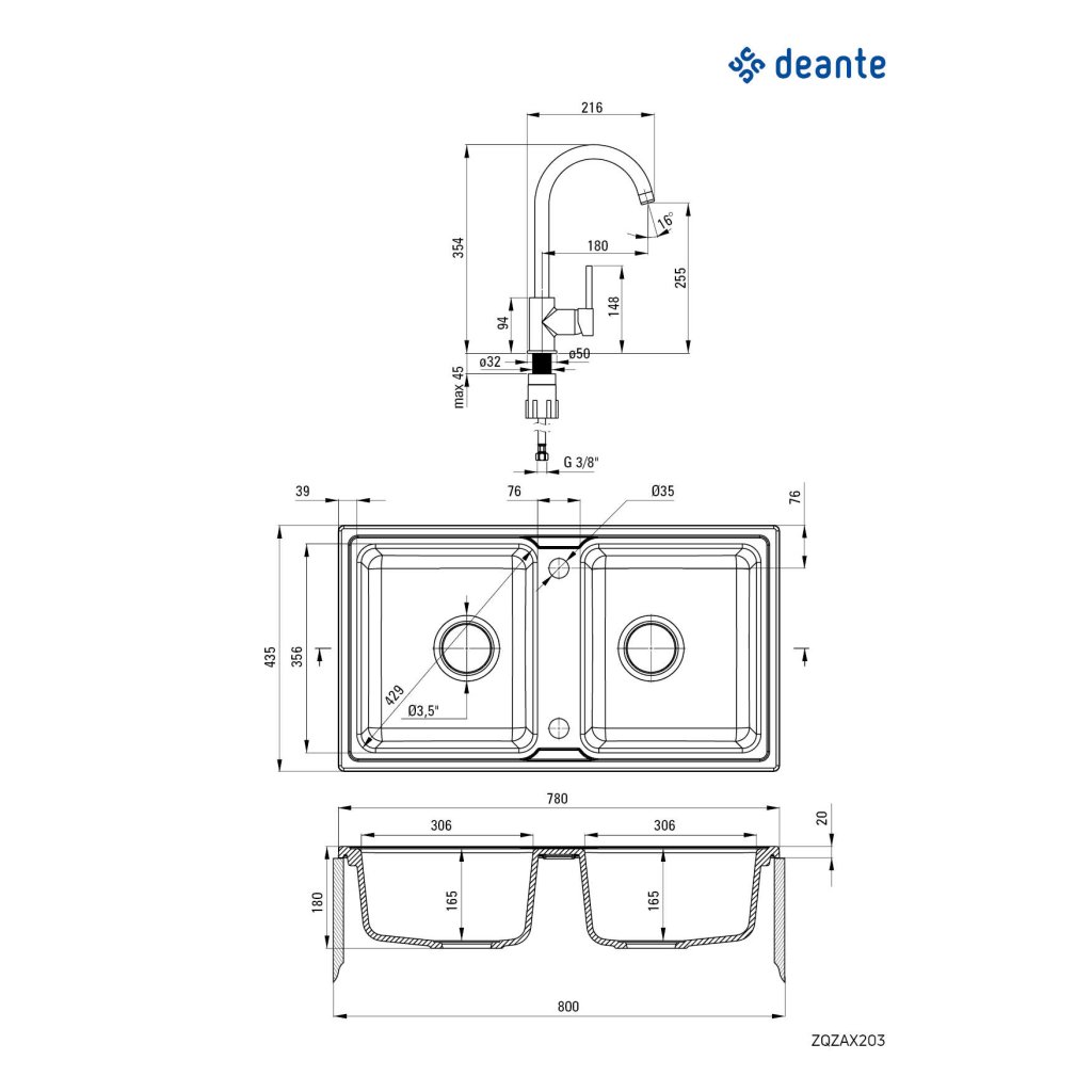 Deante Zorba, granitový dřez 780x435x180 mm B/O + prostorově úsporný sifon, 2-komorový + Nemezja baterie, grafitová, ZQZA2203